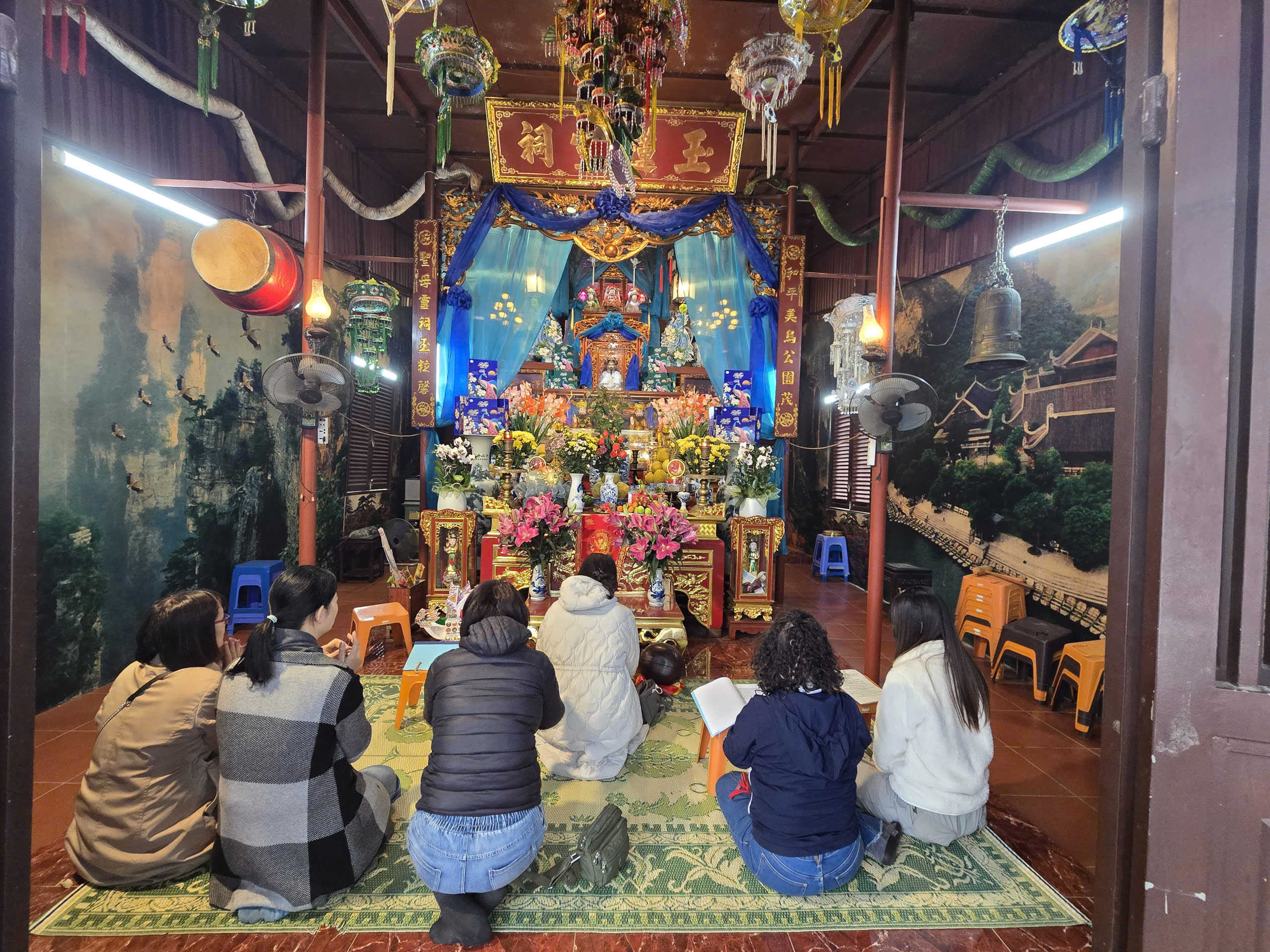 Biết đến “đảo mèo” qua mạng xã hội, Khánh Ngọc (bên trái ảnh) và Châu Anh (phường Việt Hưng, Hà Nội) cùng mẹ lần đầu ghé thăm hòn đảo, mang theo thức ăn cho mèo như gan, ức gà. “Nhà mình nuôi 5 con mèo nên rất thích những không gian như thế này. Gia đình mình đến đảo để cúng lễ, sau đó tham quan, thư giãn trong không gian yên tĩnh, cảm giác rất dễ chịu", Khánh Ngọc chia sẻ.