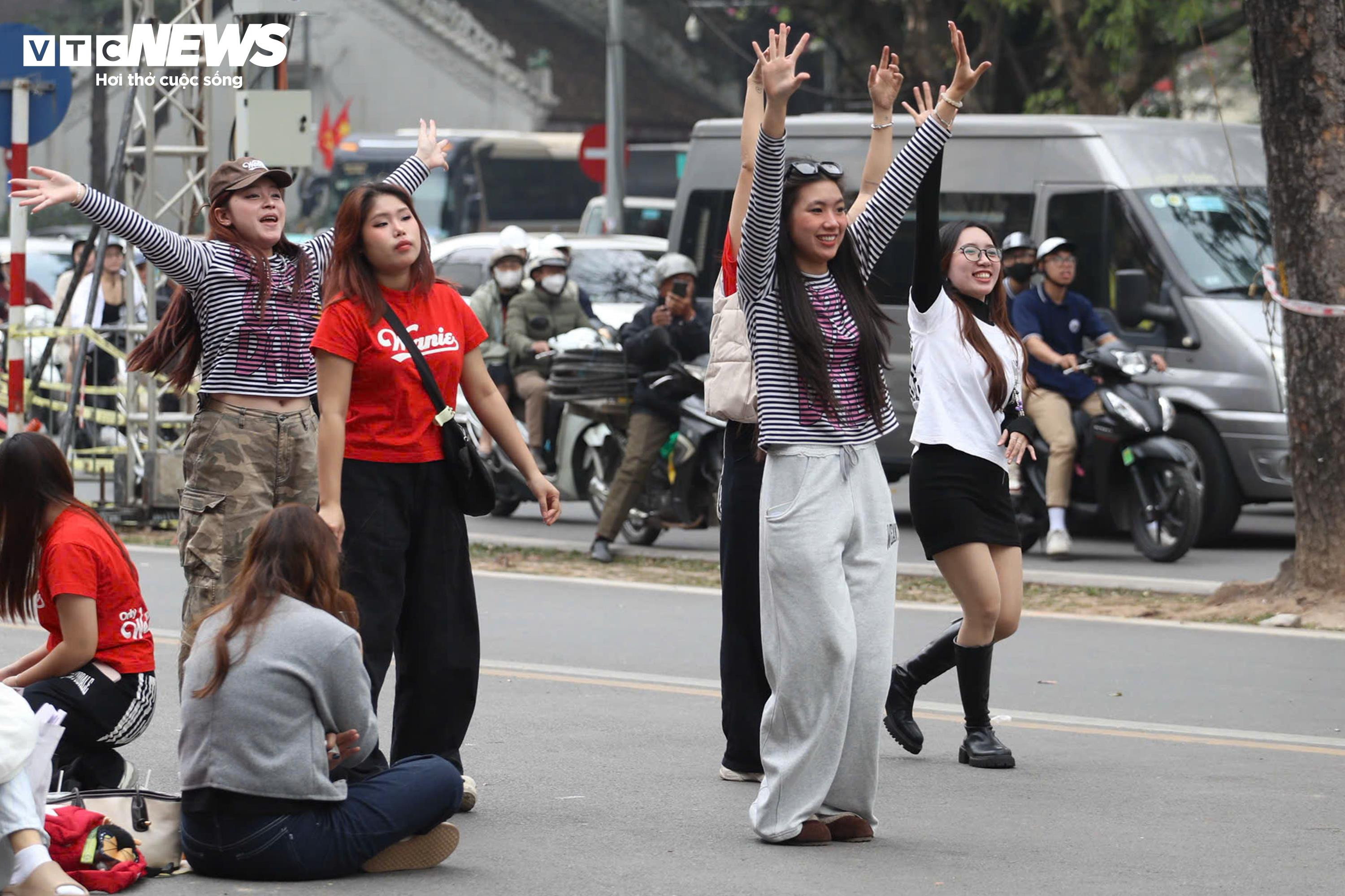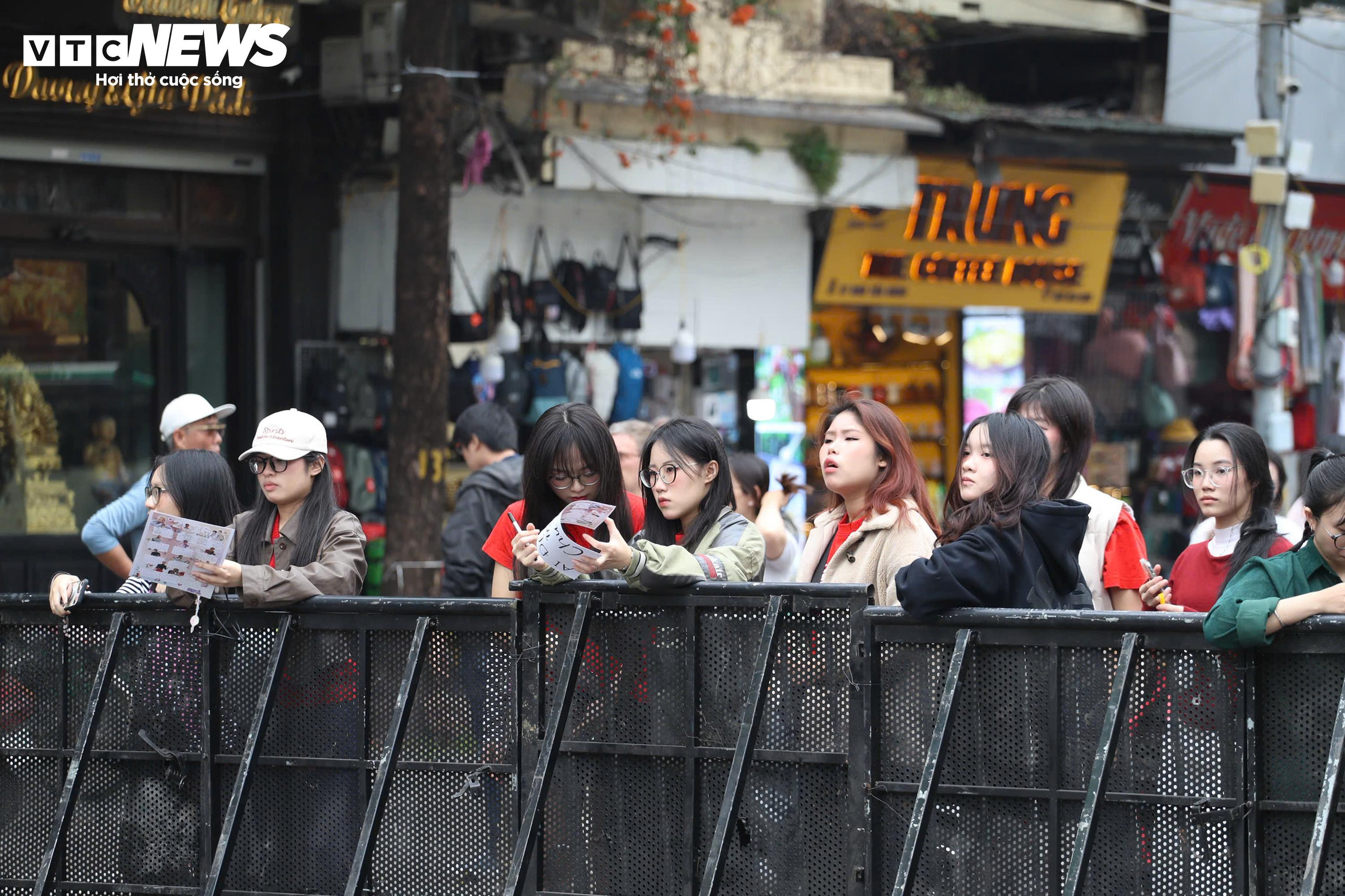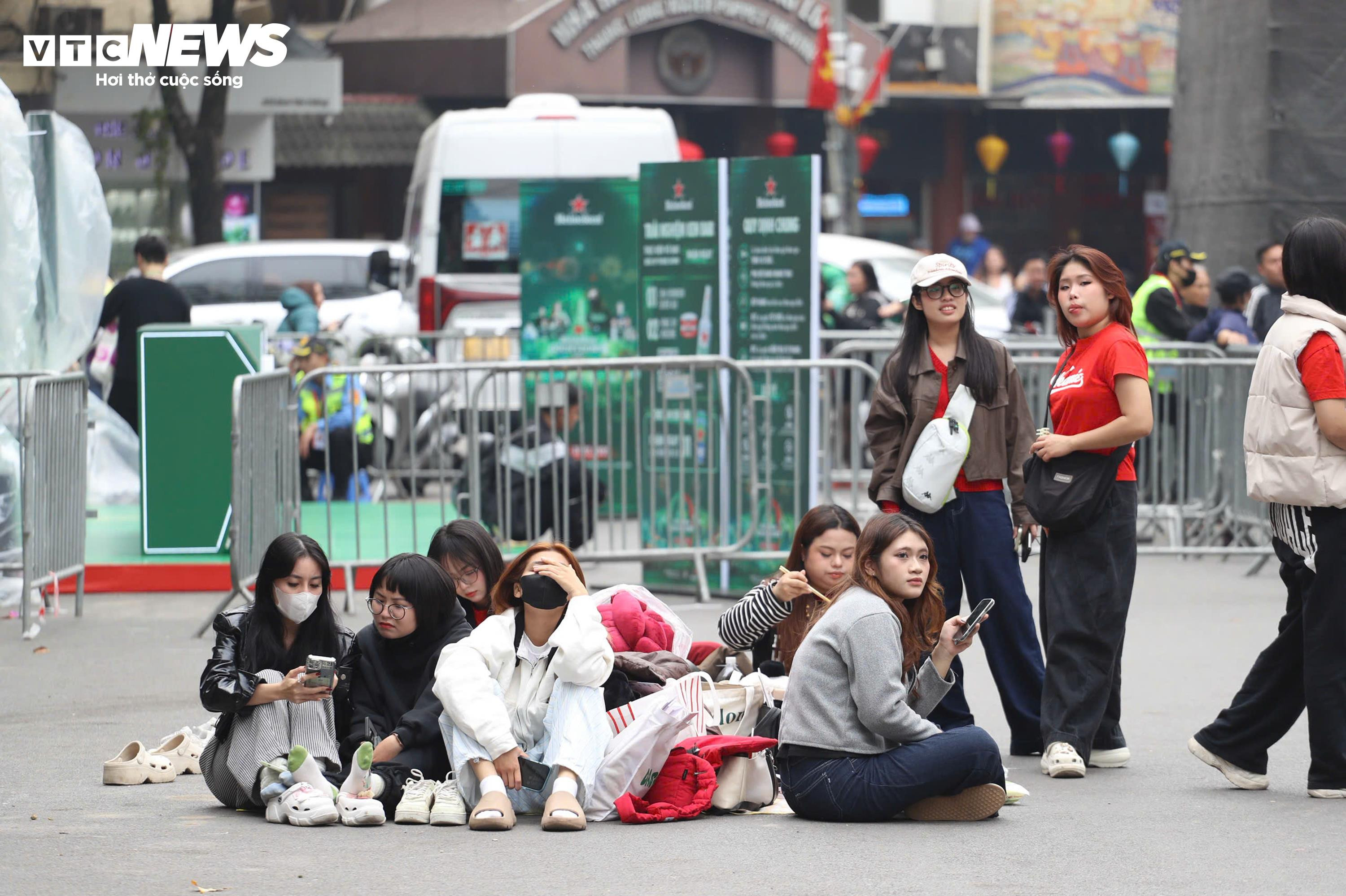 Dọc các tuyến đường quanh Hồ Gươm, nhiều nhóm bạn trẻ trải bạt, ngồi thành từng nhóm trò chuyện, chụp ảnh và tranh thủ ăn uống trong lúc chờ đợi.