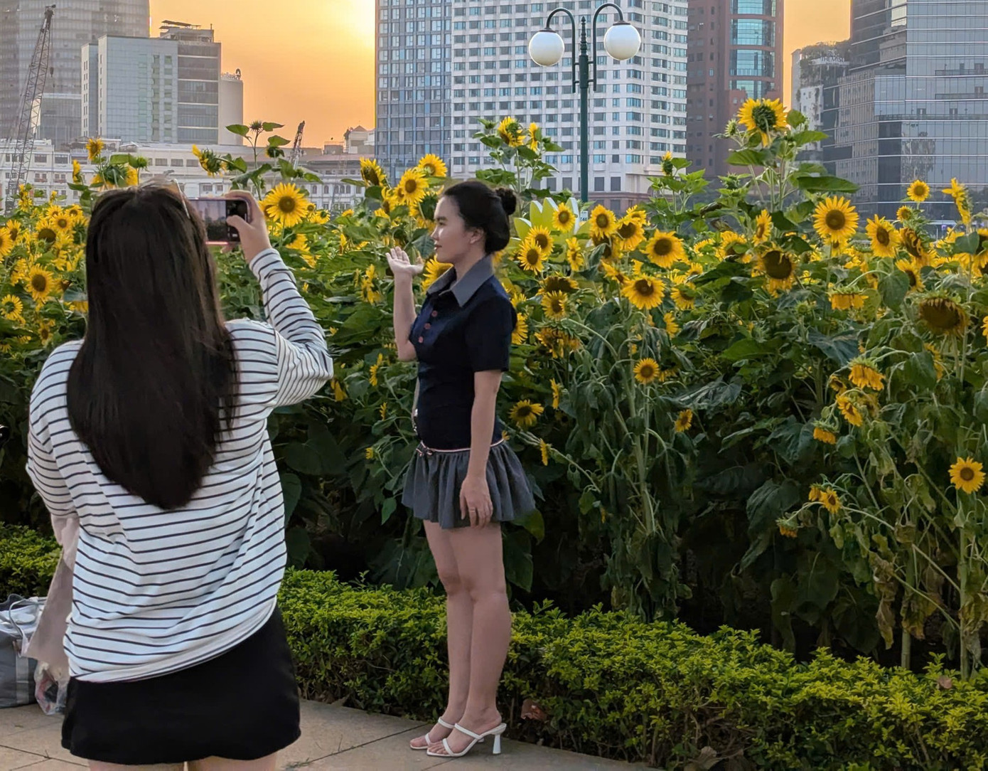 Cùng chung hào hứng, Xuân Mai (22 tuổi), một người đam mê nhiếp ảnh, cho biết: “Mình thấy góc chụp ở đây rất đa dạng, đặc biệt là góc nhìn hướng về phía các tòa nhà cao tầng. Sự tương phản giữa vườn hoa hướng dương và vẻ hiện đại của Sài Gòn tạo ra một cảm giác rất thú vị. Mình và nhóm bạn đã có mặt từ 3h chiều để khảo sát góc chụp và chờ đợi 'giờ vàng' lúc hoàng hôn để bắt được ánh sáng đẹp nhất”.