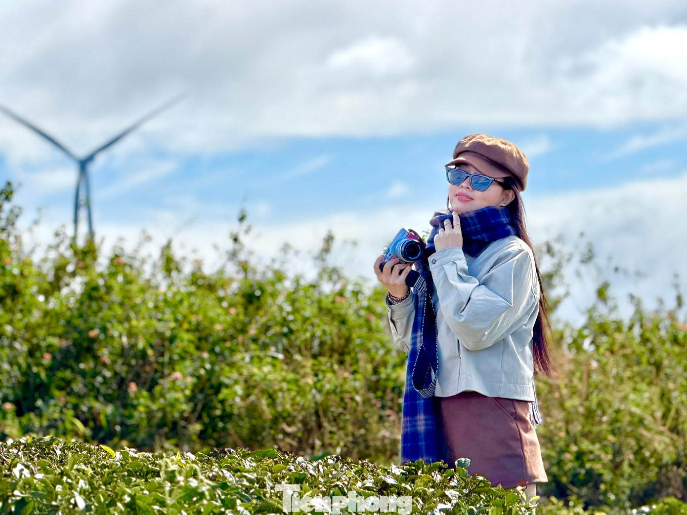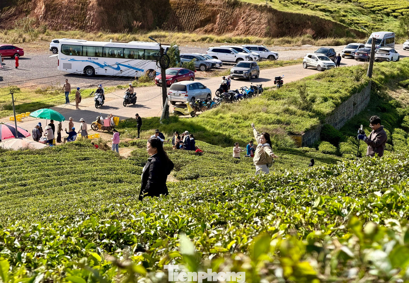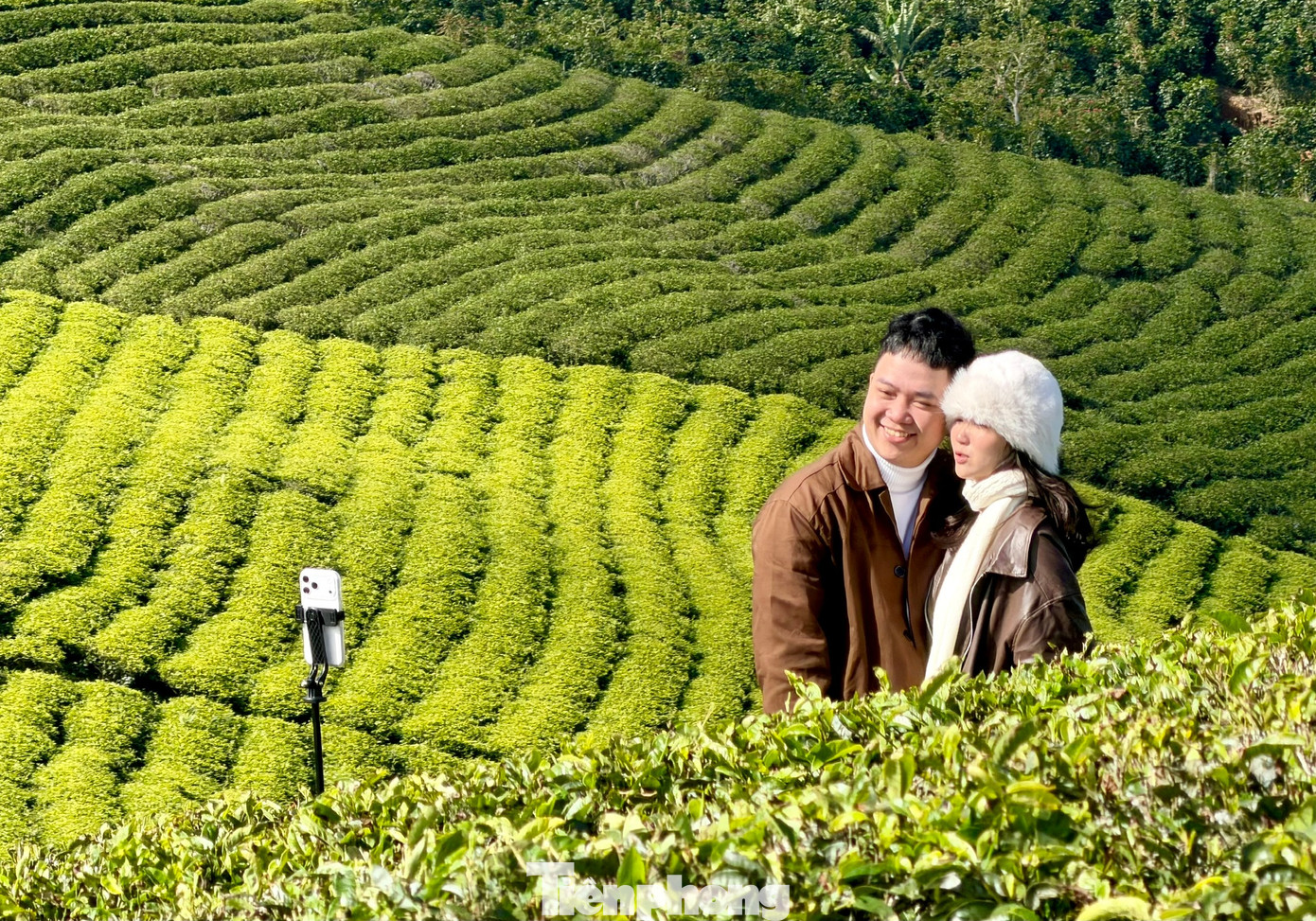 Các bạn trẻ check in từng góc chè xanh mướt, ánh nắng ban mai và làn sương mờ ảo để có bức ảnh ưng ý. "Mỗi góc ở đây đều như một bức tranh. Chỉ cần đứng vào là có ảnh đẹp để đăng ngay", bạn Quan Minh (du khách đến từ TP.HCM) chia sẻ.