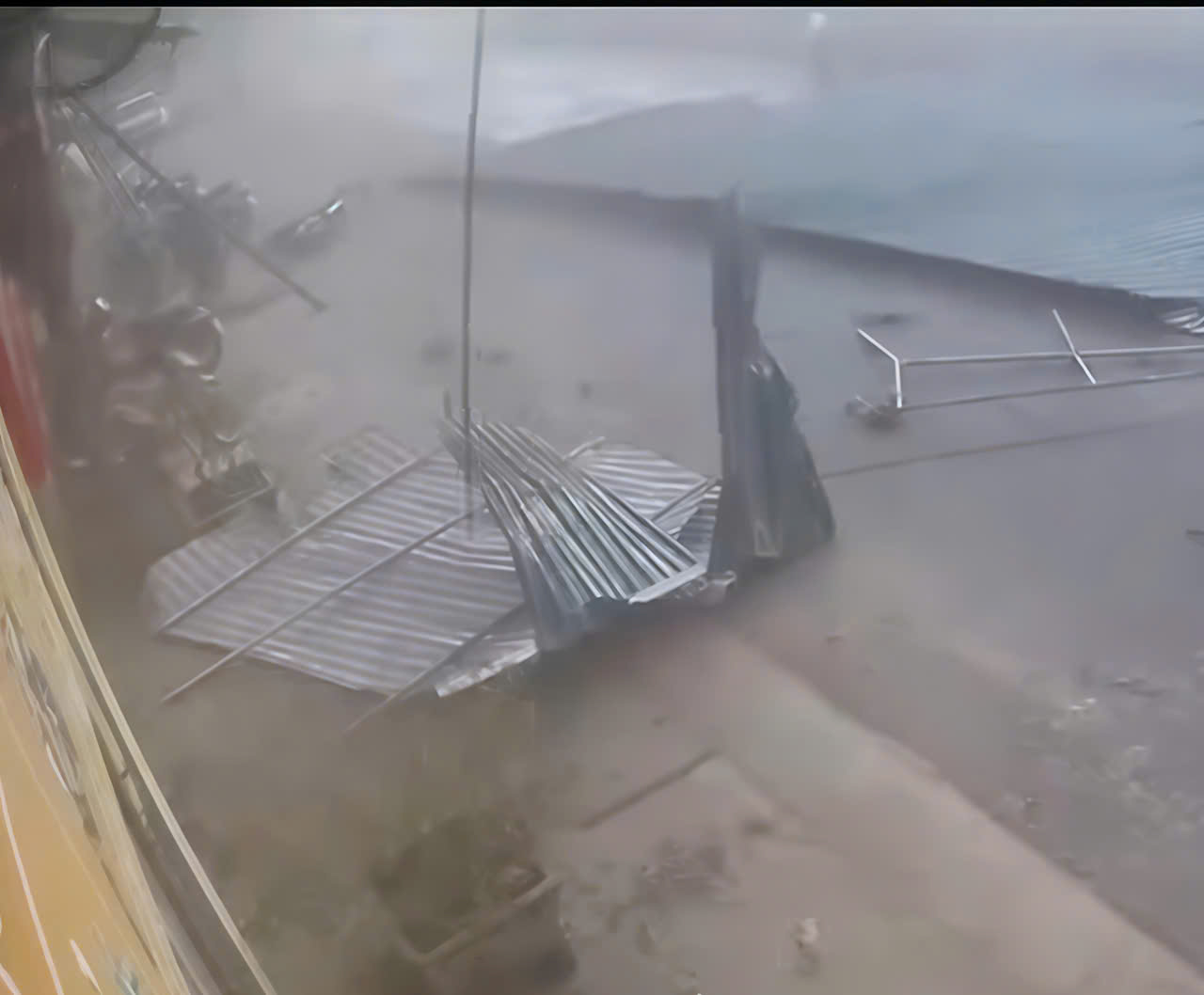 Mái tôn của nhà dân bị giông cuốn bay xuống đường. Ảnh cắt từ clip