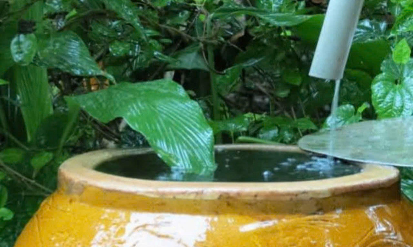 Cái lu đựng nước mưa sau nhà, mấy hôm nay chưa đậy nắp.