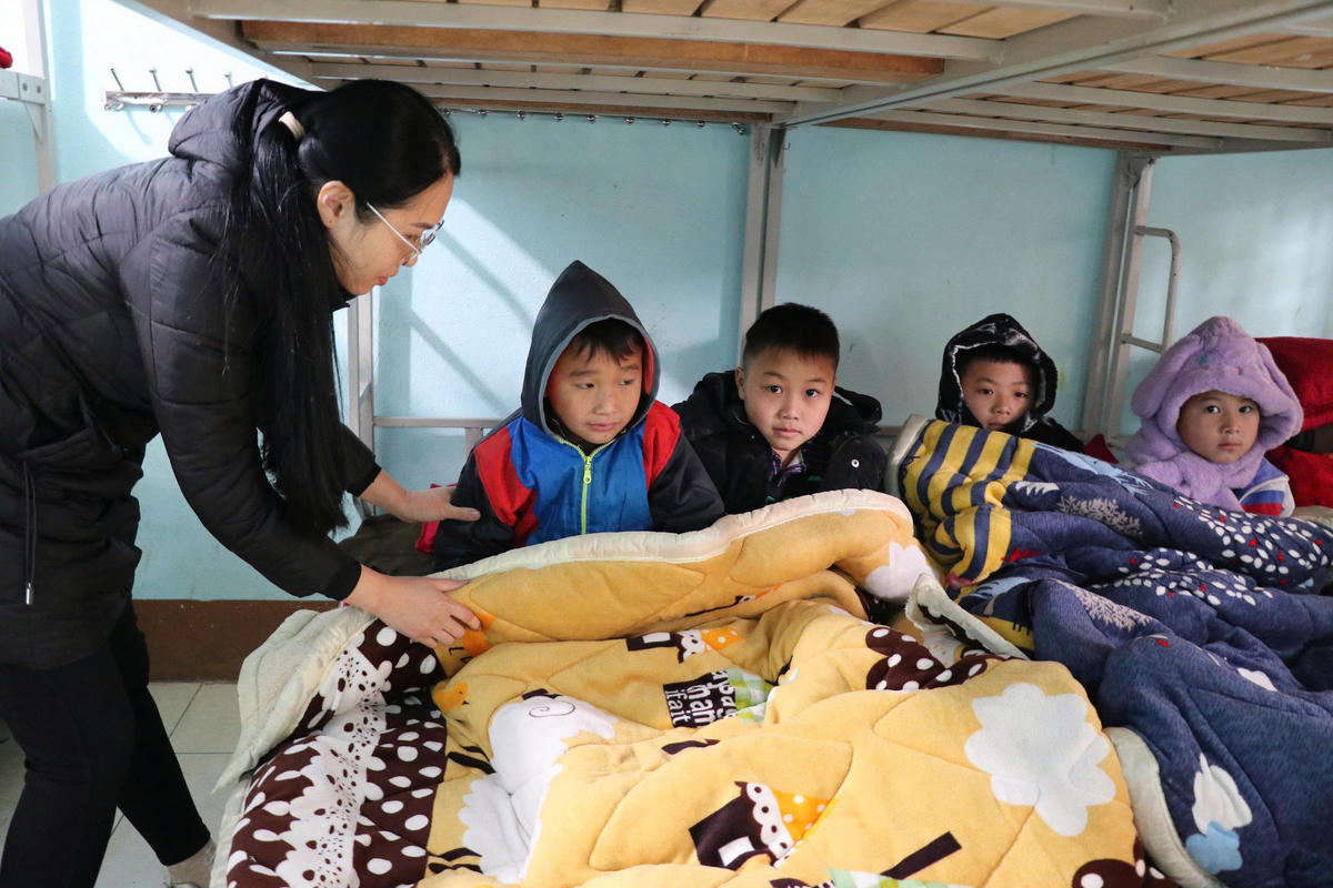 Từ khu bán trú đến lớp học, các phòng ở đều được che chắn kín gió, chăn đệm được bổ sung, phơi sấy khô thường xuyên. Giáo viên trực bán trú kiểm tra giấc ngủ, sinh hoạt của học sinh hằng ngày, nhắc nhở các em giữ ấm trong điều kiện nhiệt độ xuống thấp.