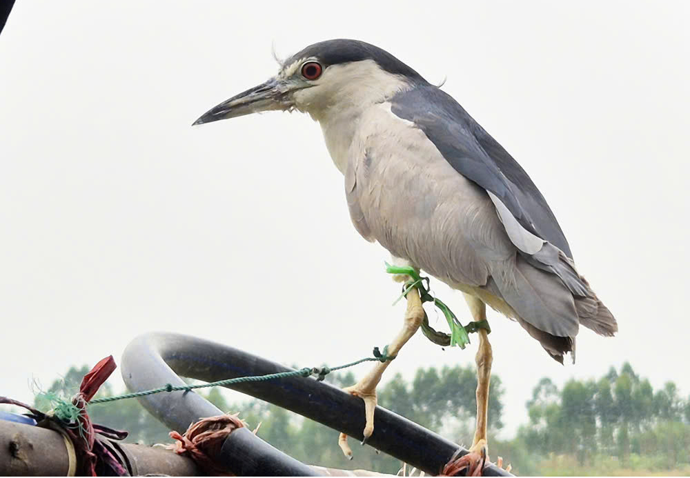 Một con cò bị buộc chặt chân để làm mồi nhử.