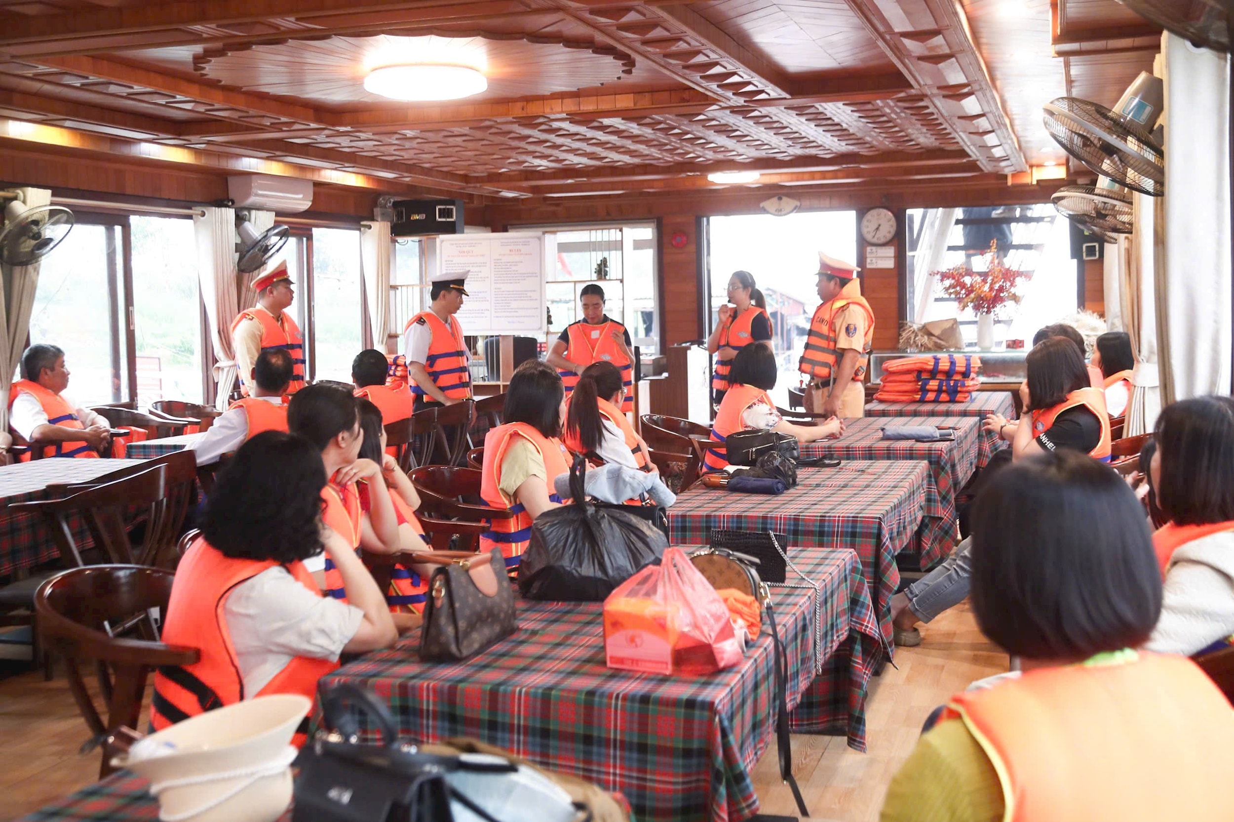 Du khách trên tàu cũng đều được trang bị áo phao. Ảnh: Ngọc Tiến