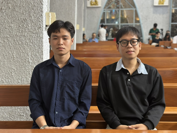 Hai bạn trẻ Vũ Tiến Phát và Trần Gia Huy (từ trái sang phải) ấn tượng với sự giản dị và gần gũi trong cách tổ chức lễ Giáng sinh tại Nhà thờ Chánh tòa Long Xuyên.