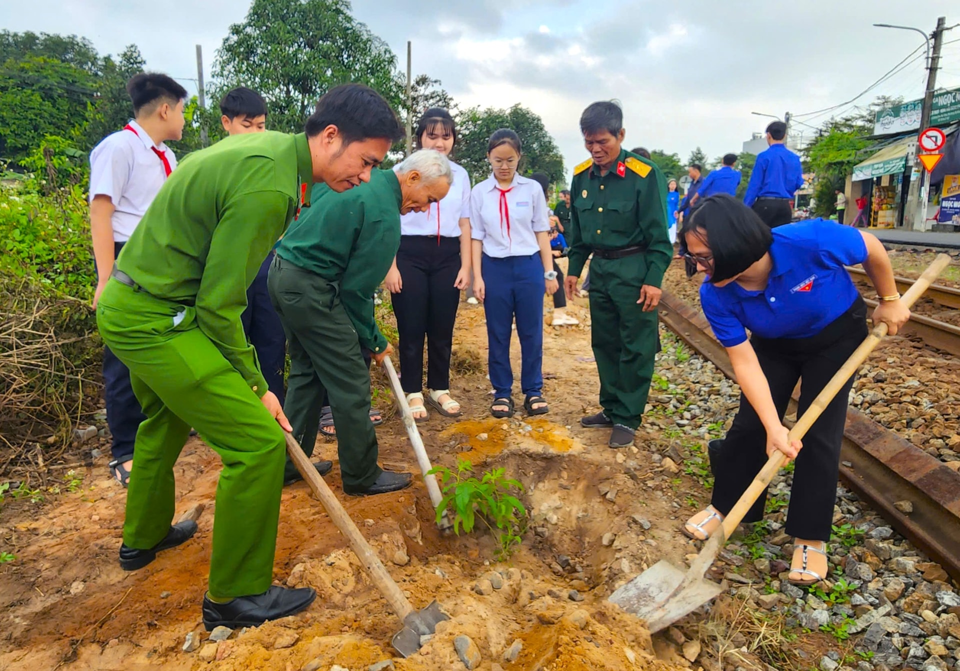 Đoàn viên, thanh niên, học sinh và cựu chiến binh tham gia trồng cây dọc hành lang an toàn đường sắt tại xã Hòa Tiến. Ảnh: HỒNG NGỌC