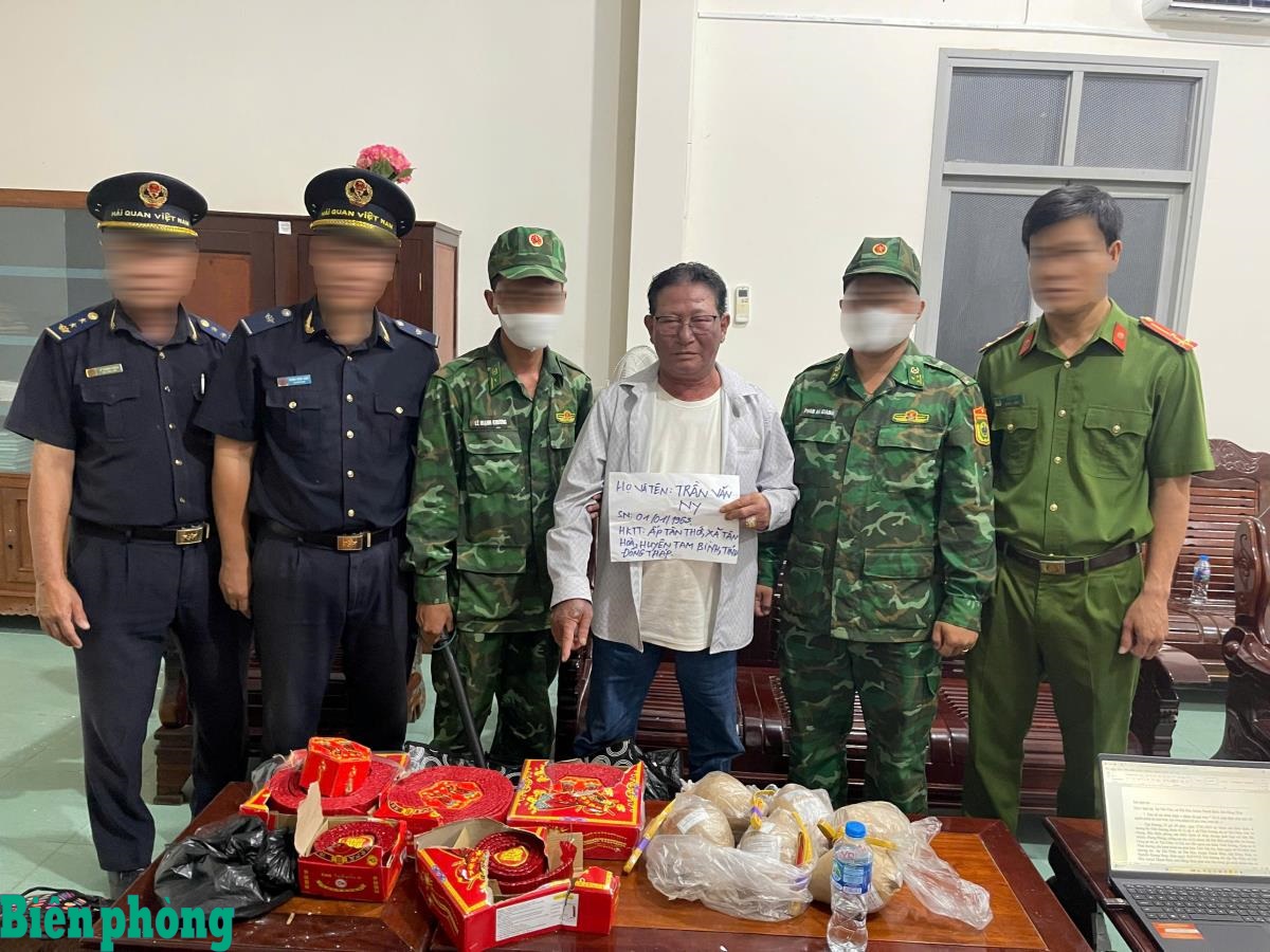 Đối tượng buôn lậu pháo hoa qua biên giới bị Đồn Biên phòng cửa khẩu quốc tế Vĩnh Xương phối hợp với Công an, Hải quan bắt giữ. Ảnh: Hồng Nam
