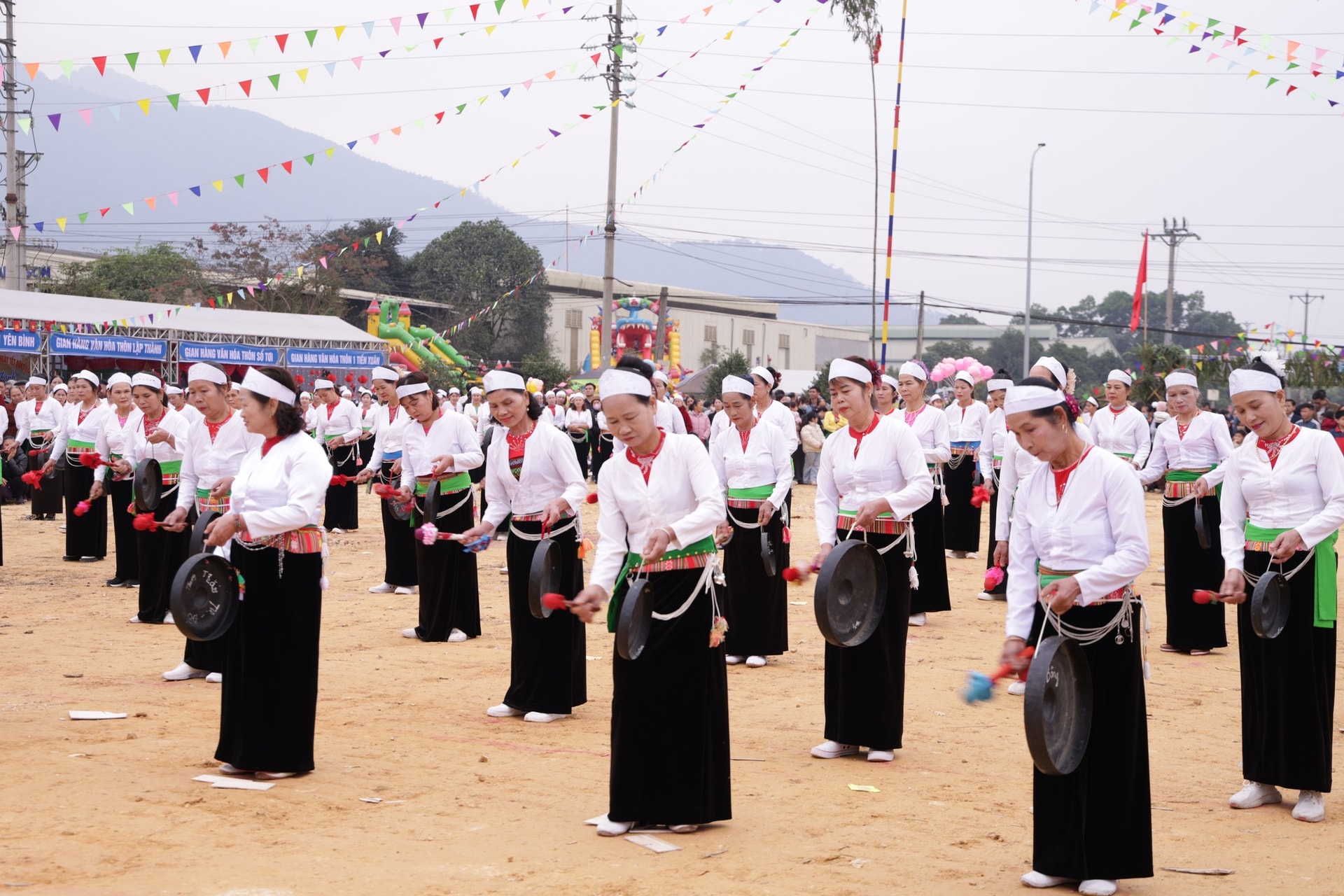 Tiết mục biểu diễn chiêng Mường tại Ngày hội văn hóa dân tộc Mường, xã Yên Xuân năm 2026. Ảnh: Hữu Thiện.