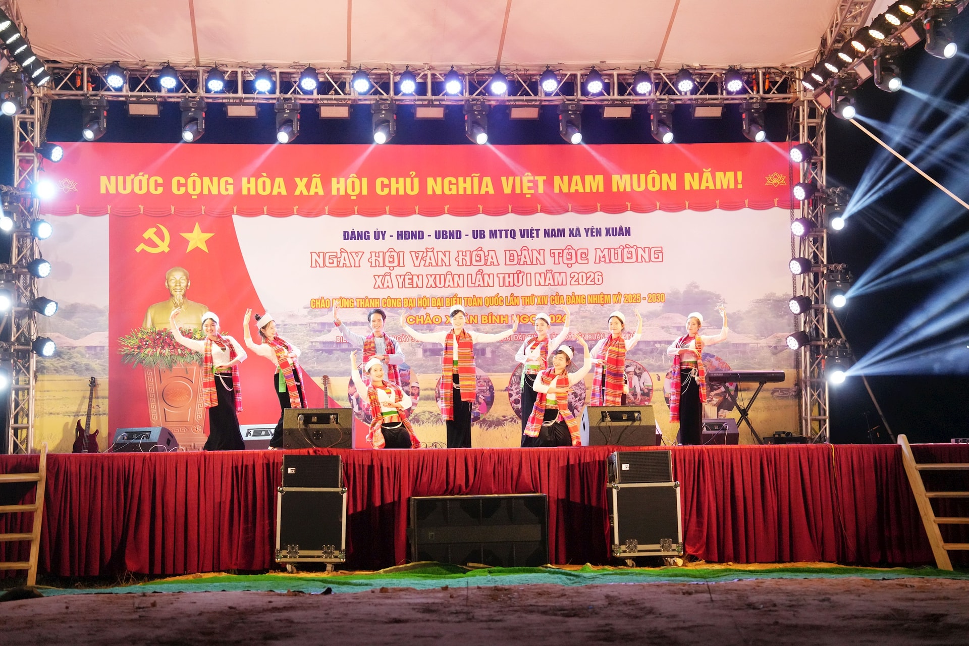 Bài múa truyền thống với trang phục người Mường trong Ngày hội văn hóa dân tộc Mường, xã Yên Xuân năm 2026. Ảnh: Công Phương.