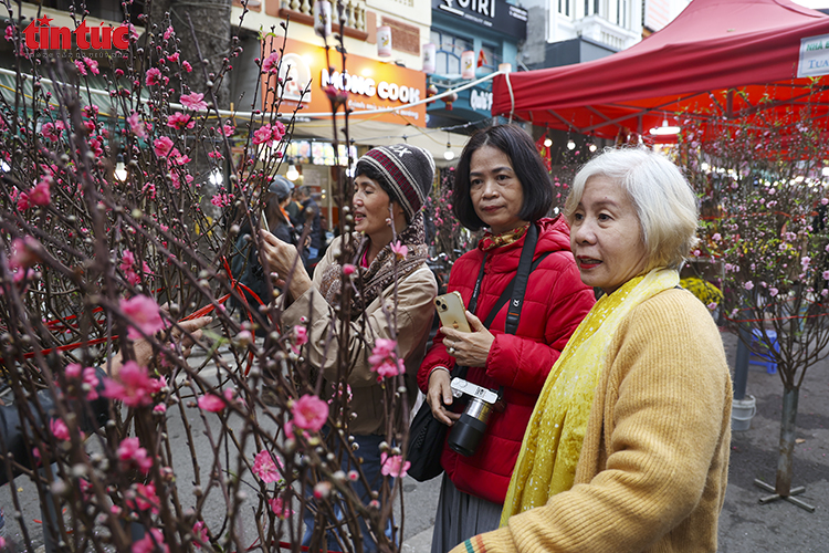 Nhiều người cao tuổi dạo chợ, chọn đào và ghi lại khoảnh khắc xuân giữa không gian phố cổ.