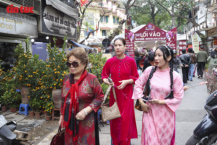 Nhiều bạn trẻ trong trang phục áo dài dạo chợ hoa, lưu giữ hình ảnh Tết cổ truyền giữa lòng Thủ đô.