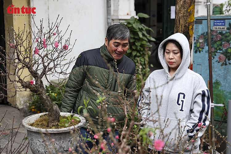 Người dân lựa chọn cành đào phai tại chợ hoa Hàng Lược – một nét đặc trưng của Tết Hà Nội.