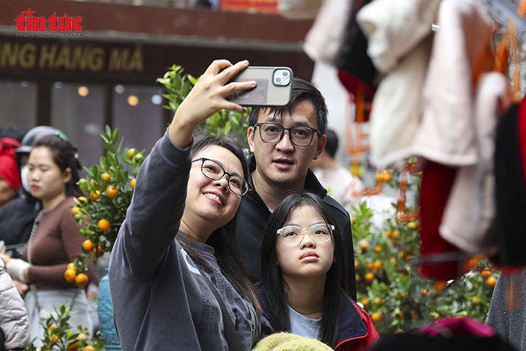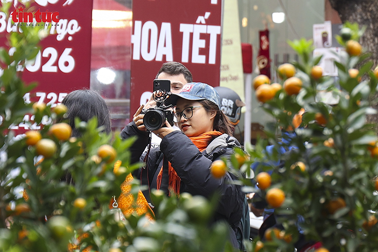Người dân ghi lại khoảnh khắc tại chợ hoa giữa không gian ngập tràn sắc đào và quất.