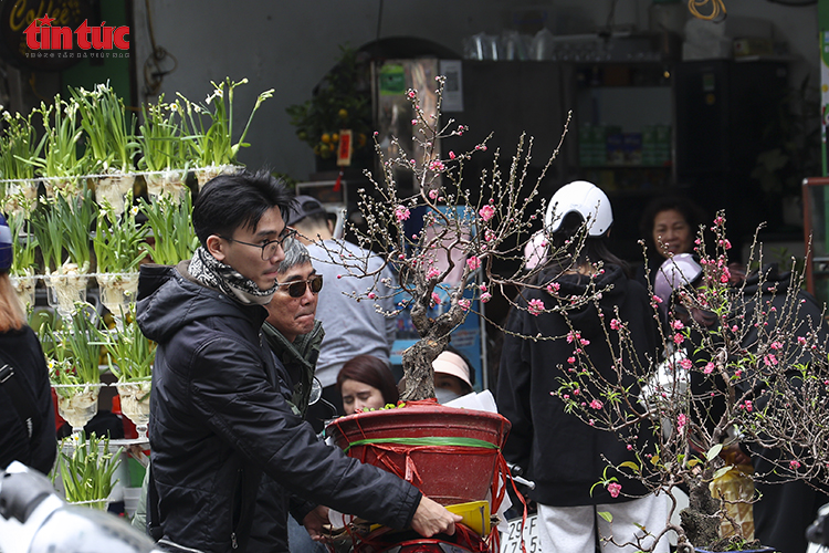 Đào thế, thủy tiên và nhiều loại hoa truyền thống được người dân lựa chọn, tạo nên không khí nhộn nhịp tại chợ hoa Hàng Lược.