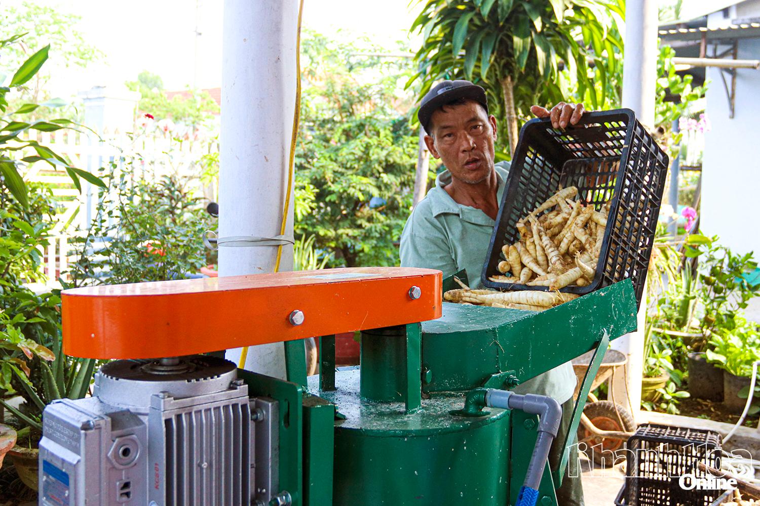 Gia đình ông Nguyễn Tùng và bà Phạm Thị Thuận ở thôn Đống Đa, xã Tây Ninh Hòa là một trong số các hộ trồng khoai hạ với 5.000m², mỗi năm thu về khoảng 3,5 đến 4 tấn củ. Ngoài ra, bà còn trồng xen một vụ dưa hấu trên những luống khoai hạ. Kế thừa nghề của gia đình, 12 năm qua, vợ chồng ông Tùng vẫn gắn bó làm bột theo phương thức truyền thống. Theo ông Tùng, có hai cách xay bột khoai hạ là xay khô hoặc xay với nước, tùy theo kinh nghiệm và điều kiện của từng gia đình. Để có mẻ bột trắng mịn, người làm phải trải qua nhiều công đoạn khác nhau. Với phương pháp xay nước, khoai được xay nhuyễn rồi lọc qua vải để loại bỏ phần bã, sau đó ngâm cho tinh bột lắng xuống và chắt bỏ nước. Tinh bột thu được sẽ ngâm và lọc nhiều lần rồi đem đi phơi, giúp bột sạch và trắng hơn. Nhờ đầu tư máy xay kiêm vắt ép, gia đình ông Tùng rút ngắn thời gian và giảm công sức khi làm bột. Cứ 6kg củ tươi thì làm ra được 1kg bột khô. Phương pháp xay nước giúp tách bã và nước riêng, còn xay khô thì phải tốn thêm công đoạn lọc bỏ bã nên vất vả hơn.
