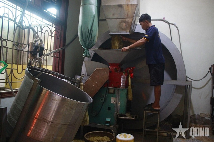 Sau khi rang xong, thóc được chuyển sang máy xát để tách trấu.