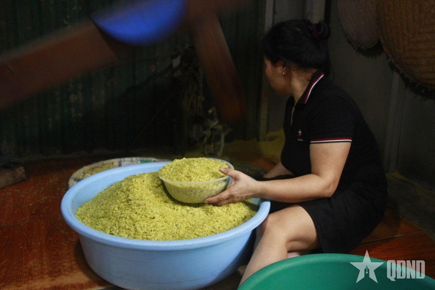 Thóc sau khi rang xong, người làm phải đợi nguội rồi cho từng mẻ vào cối để giã.