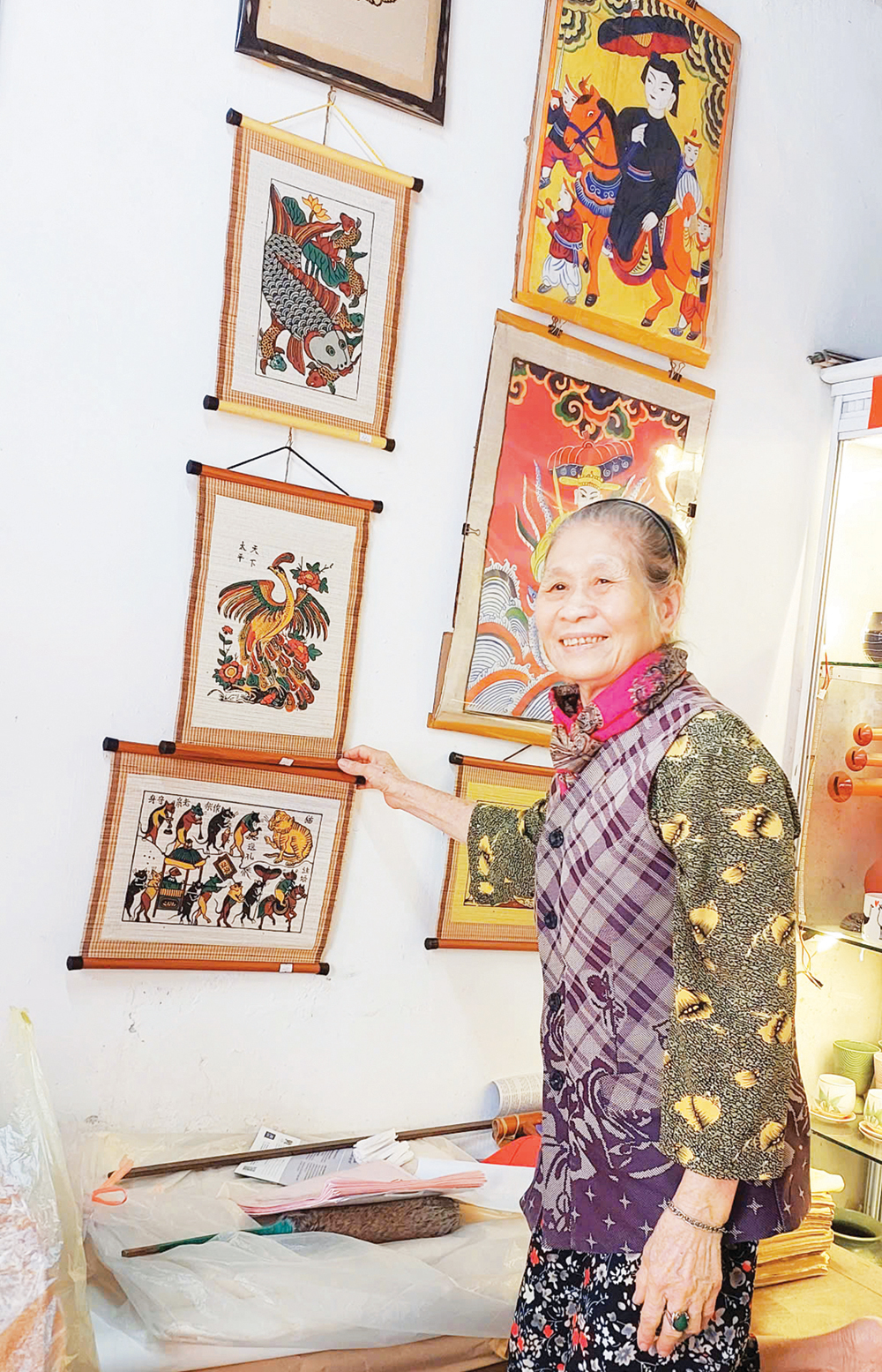 Bà Lê Thị Thanh Tâm giới thiệu tranh Đông Hồ bày bán tại cửa hàng - số 42 Hàng Cân (Hà Nội).