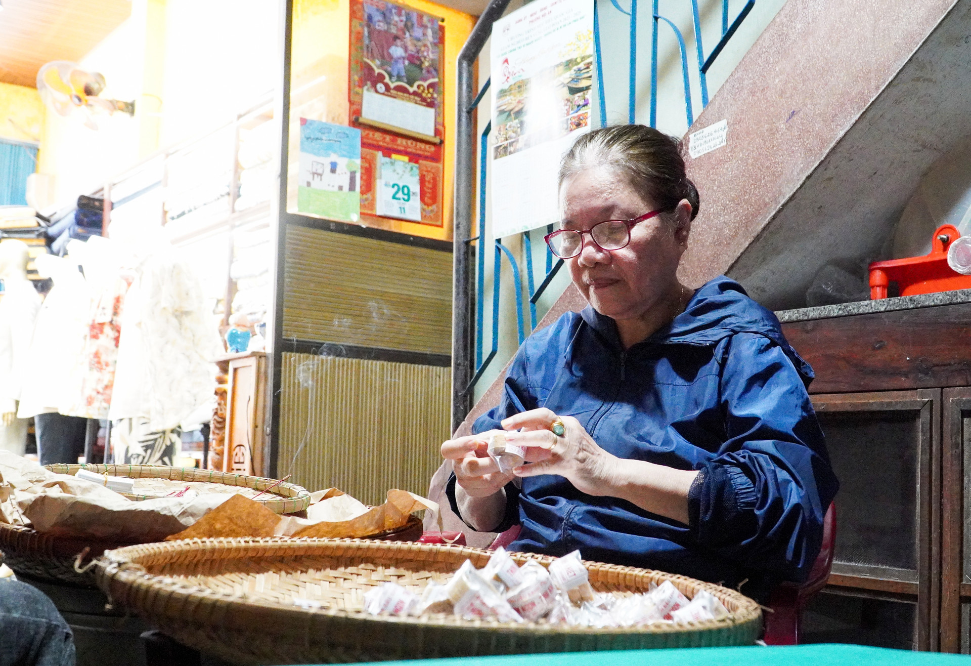 Bà Lê Thị Luận (đường Lê Lợi, phường Hội An) đóng gói bánh đậu xanh theo phương pháp thủ công. Ảnh: HỒ QUÂN