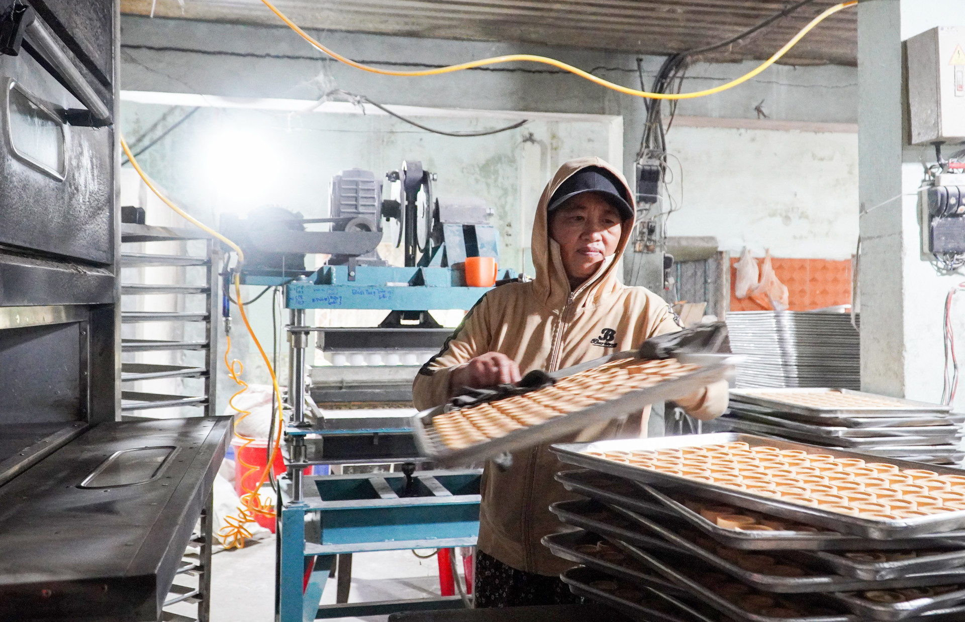 Hộ ông Đinh Xuân Cầm (thôn An Lạc) năm nay sản xuất khoảng 2 tấn bánh. Trước đây, mọi công đoạn đều thủ công nên khá vất vả. Nay máy móc hỗ trợ khâu nướng, người làm đỡ phần nặng nhọc. Tuy vậy, thị trường ngày càng thu hẹp khi những sản phẩm mới với mẫu mã đa dạng xuất hiện ngày một nhiều.