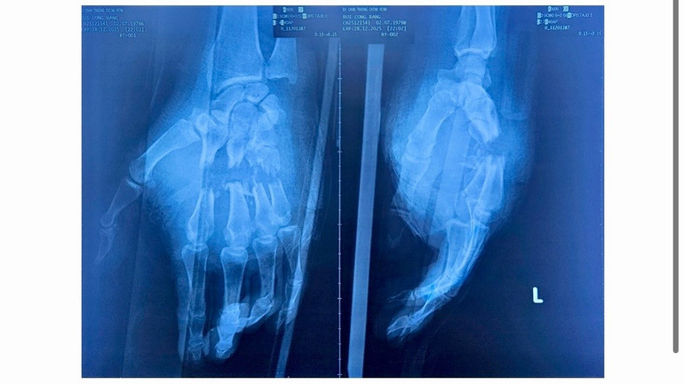 Hình ảnh chụp phim cho thấy nhiều xương ngón tay bị gãy hở.