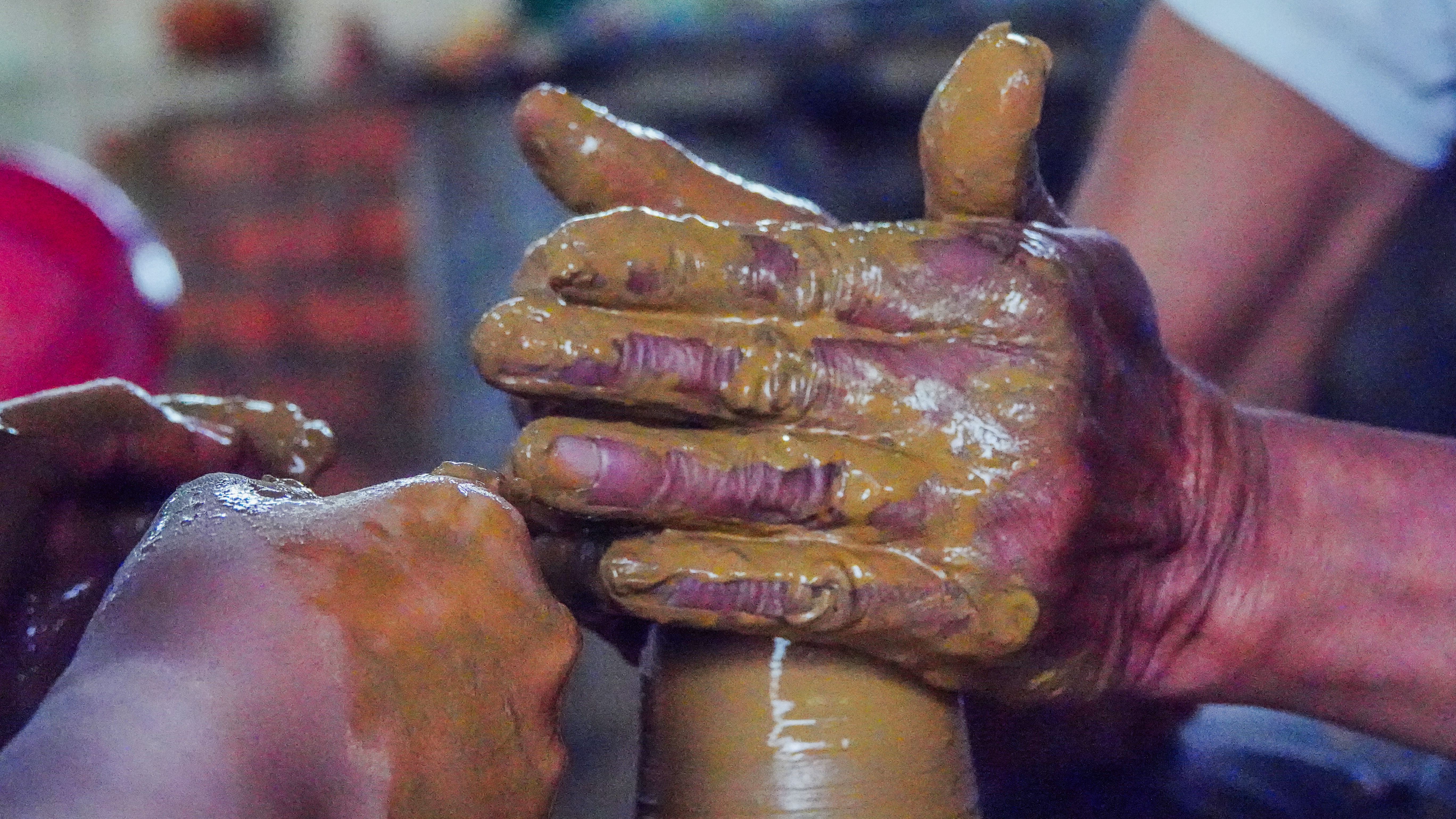 Qua năm tháng, đôi bàn tay chai sần lấm bùn đất vẫn miệt mài giữ nghề gốm. Ảnh: XUÂN QUỲNH