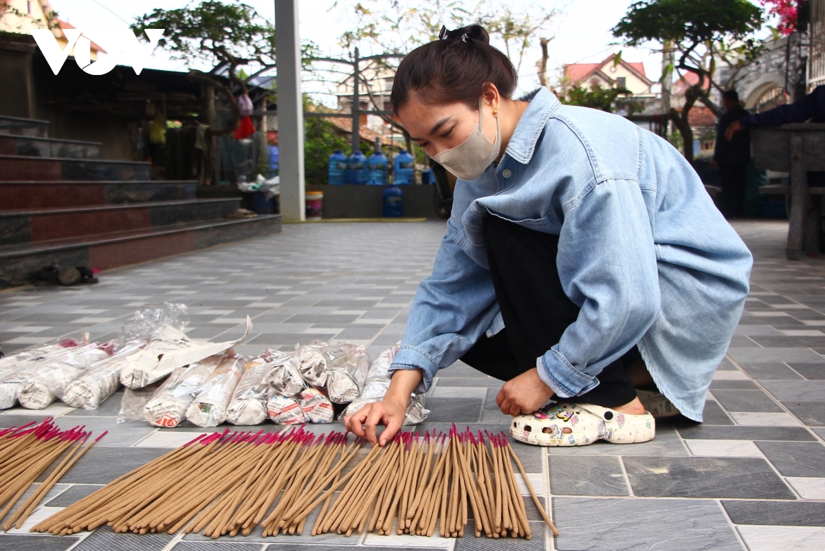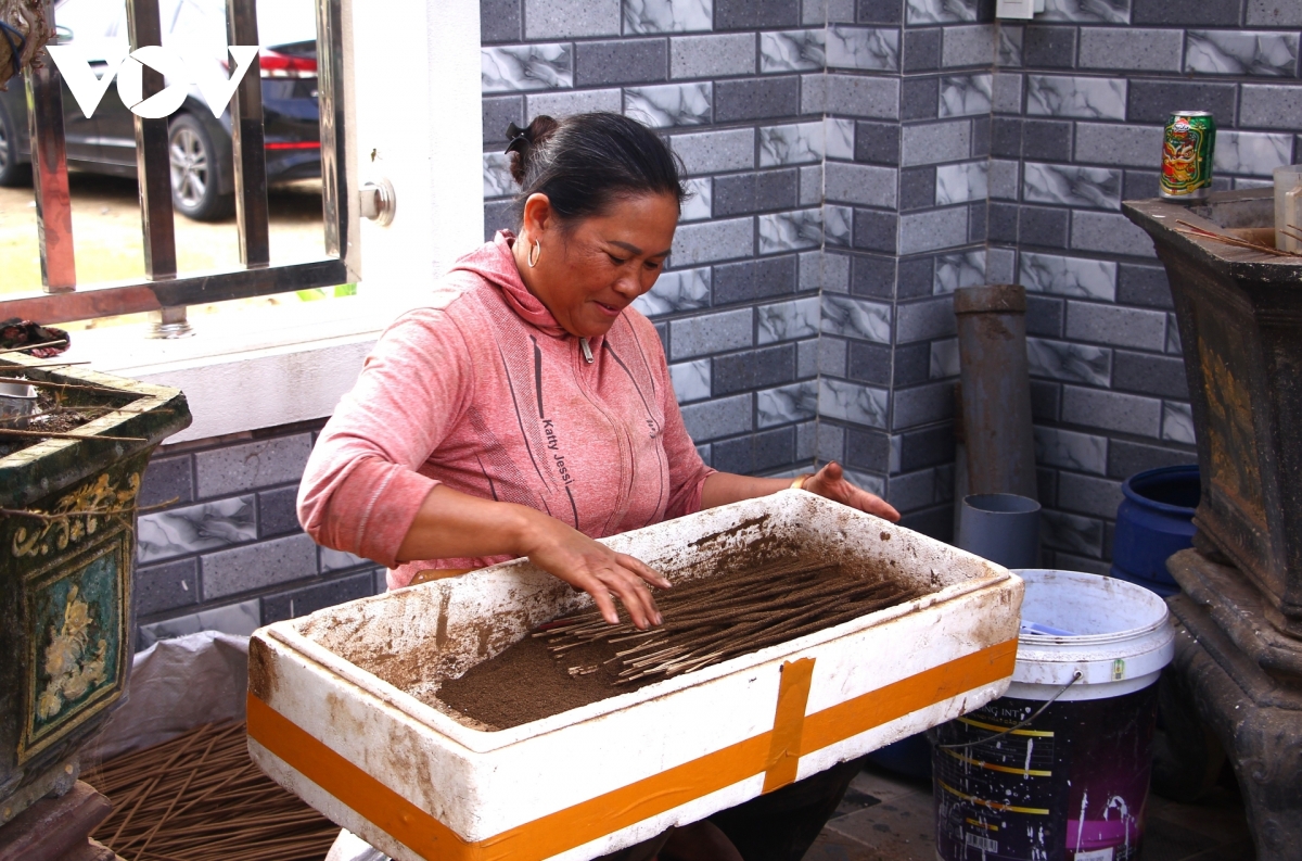 Thời tiết nắng nhẹ, thích hợp để làm hương. Tại từng sân nhà, khoảng vườn, người dân đem hương trầm vừa mới làm thủ công ra phơi nắng. Bà Nguyễn Thị Phương, 55 tuổi, ở thôn Quyết Thắng, xã Bắc Trạch, tỉnh Quảng Trị tiếp nối nghề làm hương của thế hệ trước trao truyền. Ở làng nghề này, hầu như gia đình nào cũng làm hương bán dịp Tết. Quanh năm, bà con làm nhiều công việc thời vụ khác như nông nghiệp, ngư nghiệp, bán hàng, lái xe... Cận tết, mọi người tranh thủ thời gian nhàn rỗi ở nhà làm hương, kiếm tiền mua sắm Tết và cũng là cách để giữ lửa làng nghề.