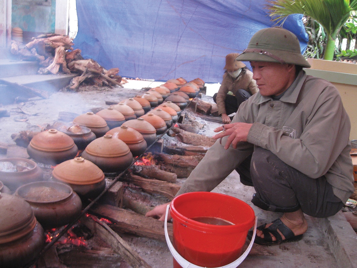 Vừa dẫn chúng tôi ra khu vực “tập kết” niêu đất, anh Thực vừa bảo: “Để có được nồi cá kho đạt tiêu chuẩn, phải trải qua nhiều công đoạn phức tạp, trước tiên là lựa chọn niêu đất”. Theo chia sẻ của anh Thực, niêu của Nghệ An kho cá là ngon nhất. Nhưng vung thì phải của Thanh Hóa. Bởi vung Nghệ An hơi sâu, khi nấu hay bị ám khói. Còn vung Thanh Hóa có hình chóp cao, khói tản lên trên nên không lo ám khói.