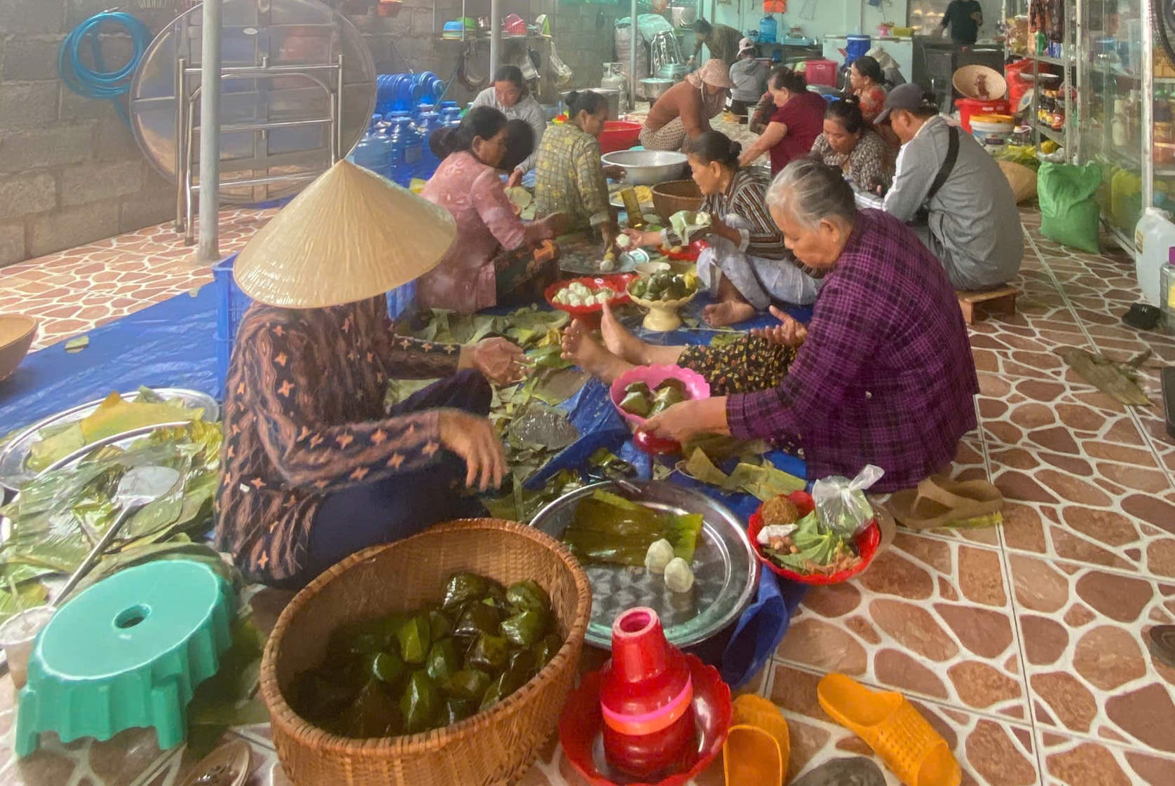 Phụ nữ cao niên Chăm ở xã Hàm Thuận gói bánh mừng Tết Katê