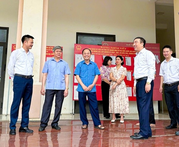 Đoàn công tác xã Kiều Phú kiểm tra công tác bầu cử tại thôn Ngọc Bài. Ảnh: Nguyễn Tuân