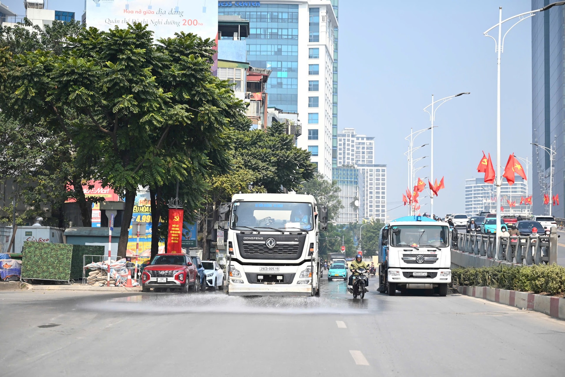 Công ty URENCO tăng cường xe rửa đường trong dịp diễn ra bầu cử. Ảnh: Ngọc Hiệp