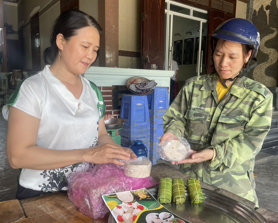Chị Tống Thị Nhung (bìa trái, vợ anh Nguyễn Duy Thanh) giới thiệu sản phẩm giò lụa của gia đình với khách hàng. Ảnh: Vũ Chi