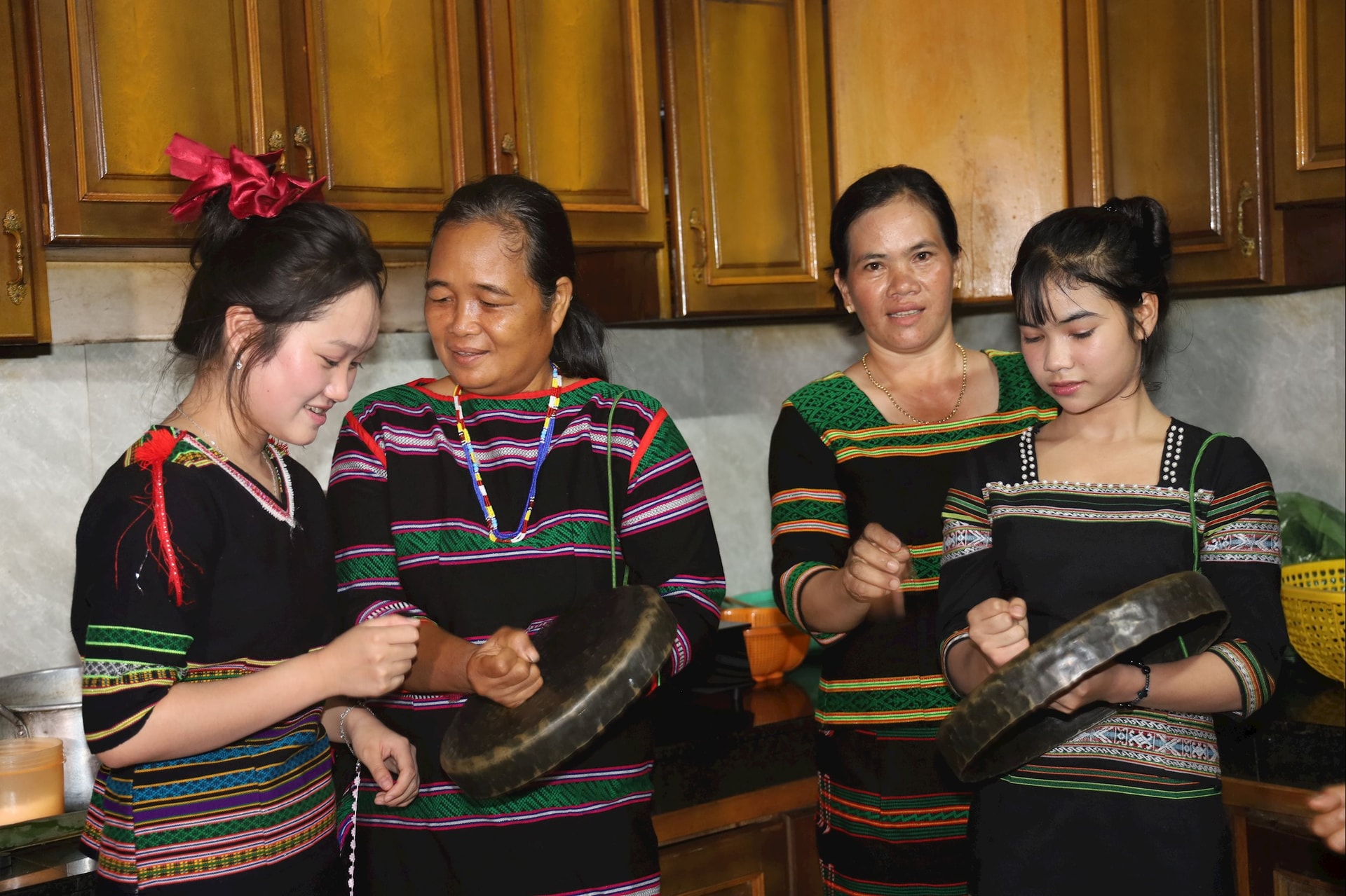 Bà Thị Hằng (người thứ 2, bên trái qua) đang hướng dẫn các bạn trẻ cách đánh chiêng