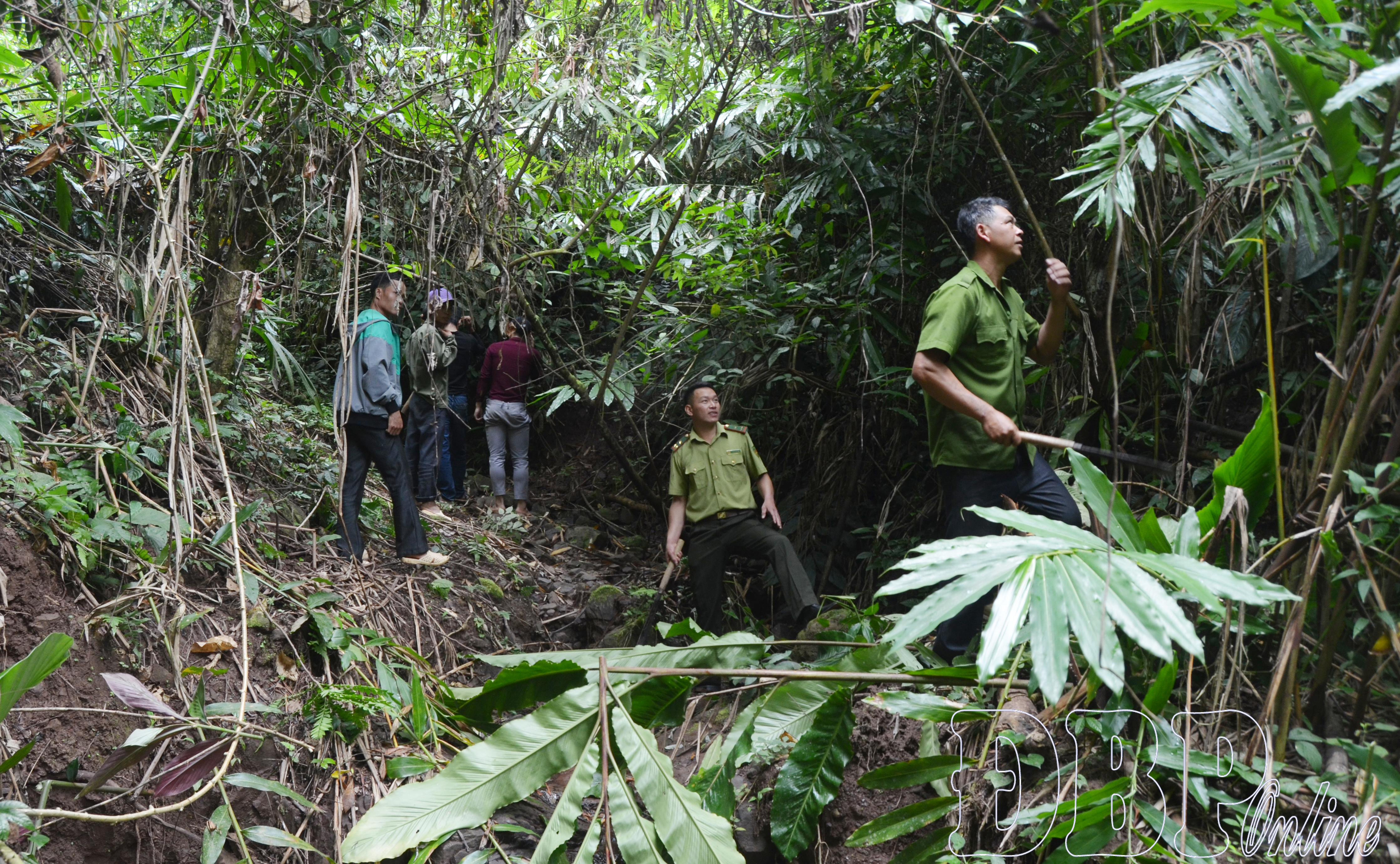 Người dân bản Pa Tần, xã Mường Chà phối hợp với cán bộ kiểm lâm tuần tra rừng.