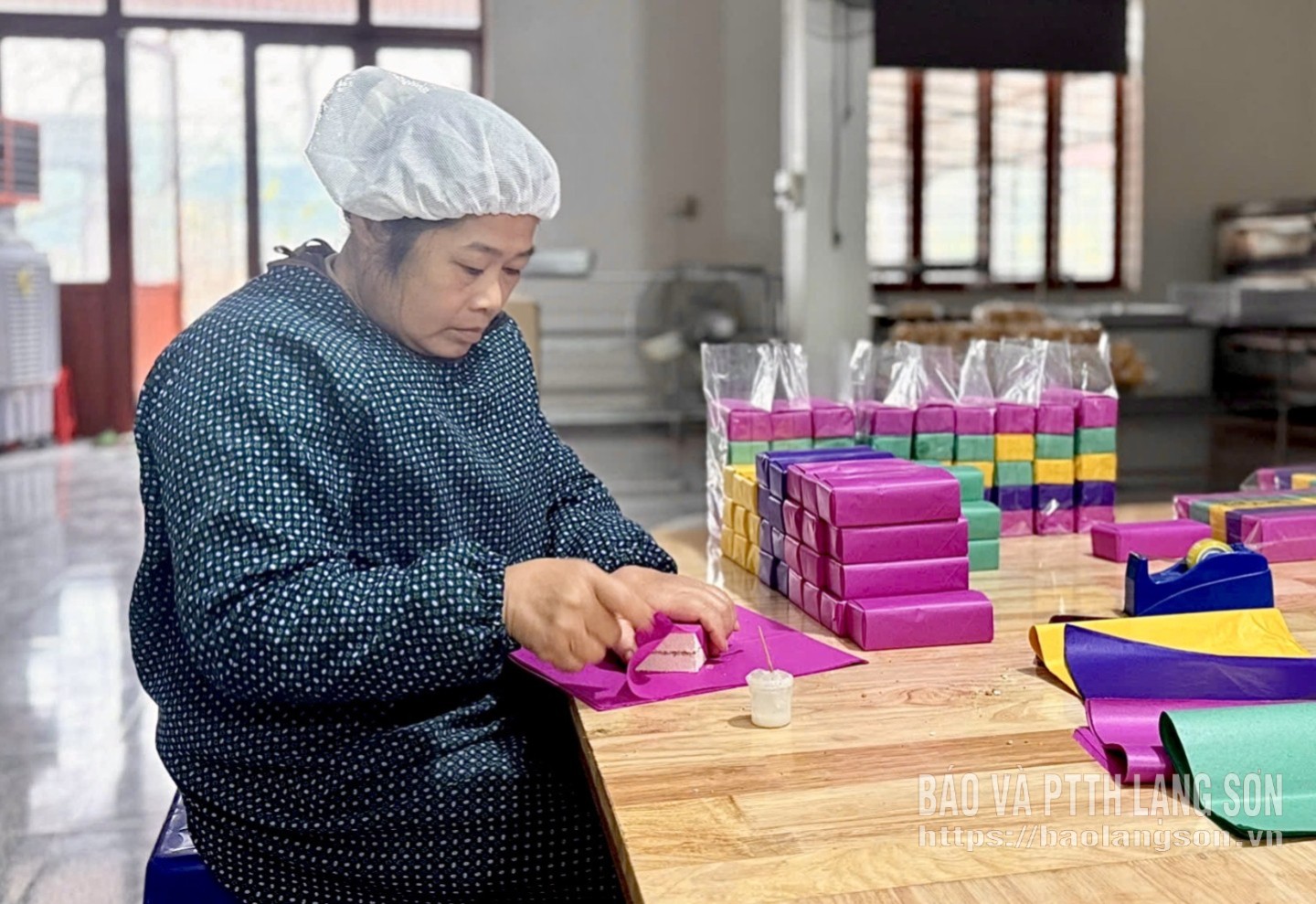 Bà Nông Thị Tuyết, chủ cơ sở sản xuất bánh khảo Nông Tuyết, thôn Khuổi Sao, xã Thất Khê đóng gói bánh khảo