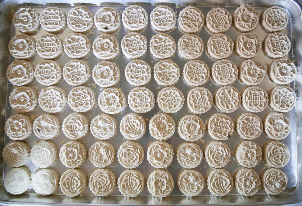 Nguyên liệu làm bánh khá giản dị, gồm bột nếp, đậu xanh, đường cát và một chút vani tạo hương thơm. Hỗn hợp sau khi trộn đều sẽ được cho vào khuôn gỗ chạm hoa văn, nén chặt rồi đem sấy khô