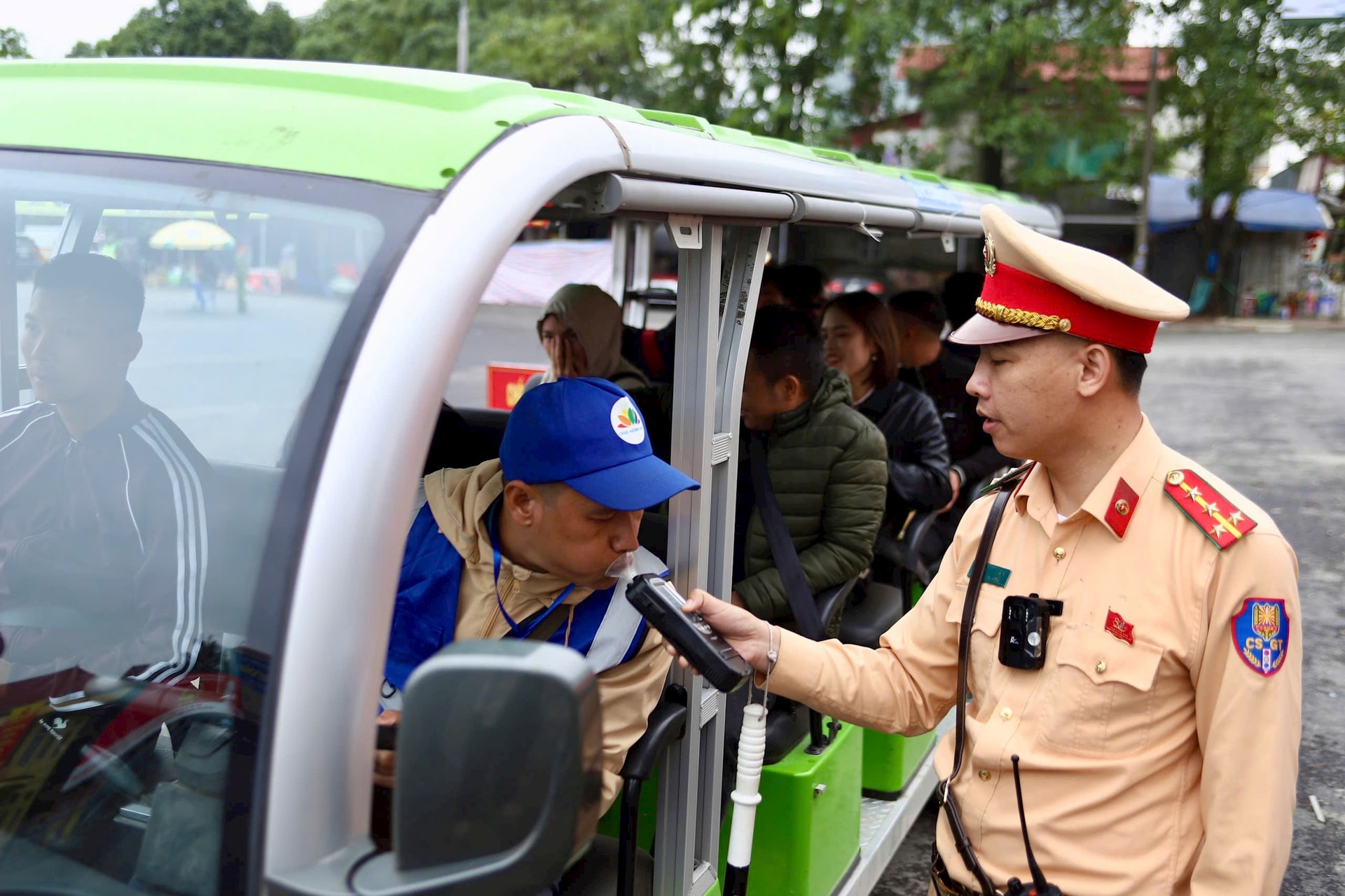 CSGT kiểm tra nồng độ cồn đối với tài xế xe điện. Ảnh: PV
