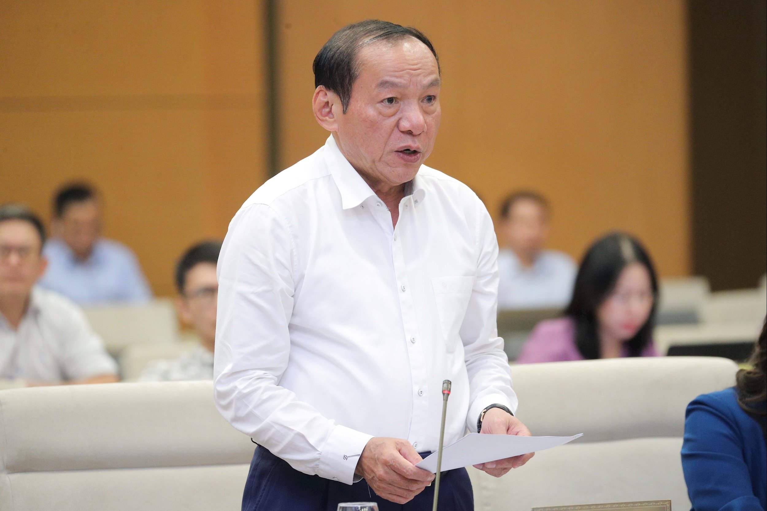 Bộ trưởng Bộ Văn hóa, Thể thao và Du lịch Nguyễn Văn Hùng trình bày tờ trình dự án Luật Báo chí (sửa đổi)
