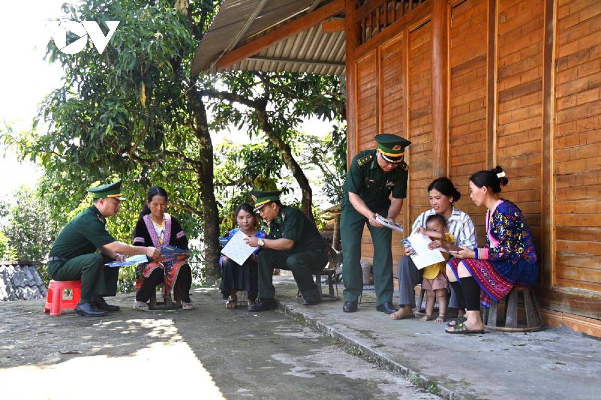 Cán bộ, chiến sĩ biên phòng Lai Châu tuyên truyền chủ trương của Đảng, chính sách pháp luật Nhà nước tại bản Pho I, xã biên giới Pa Tần