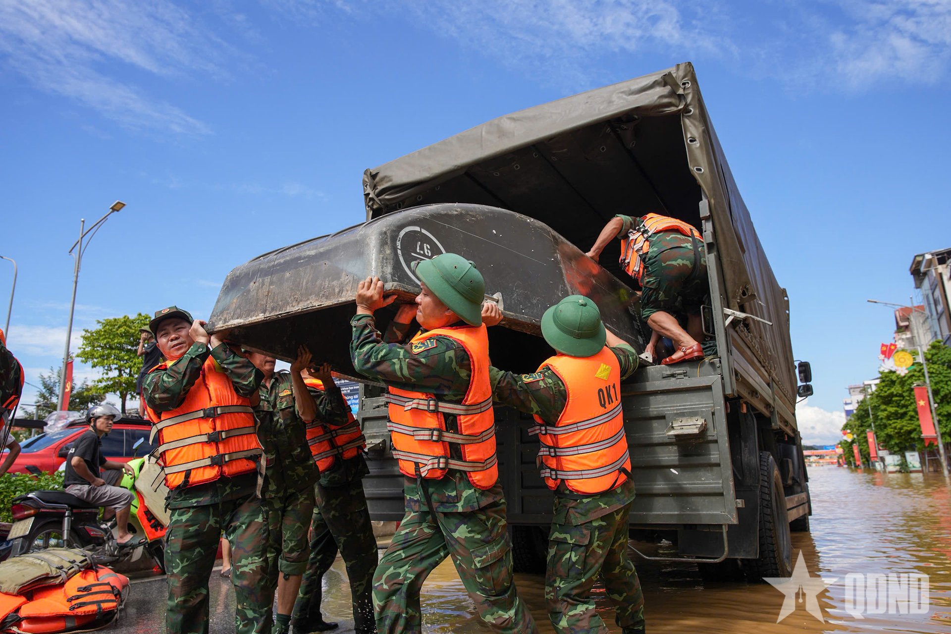 Lực lượng vũ trang Quân khu 1 triển khai phương tiện giúp nhân dân tỉnh Thái Nguyên khắc phục hậu quả lũ lụt.