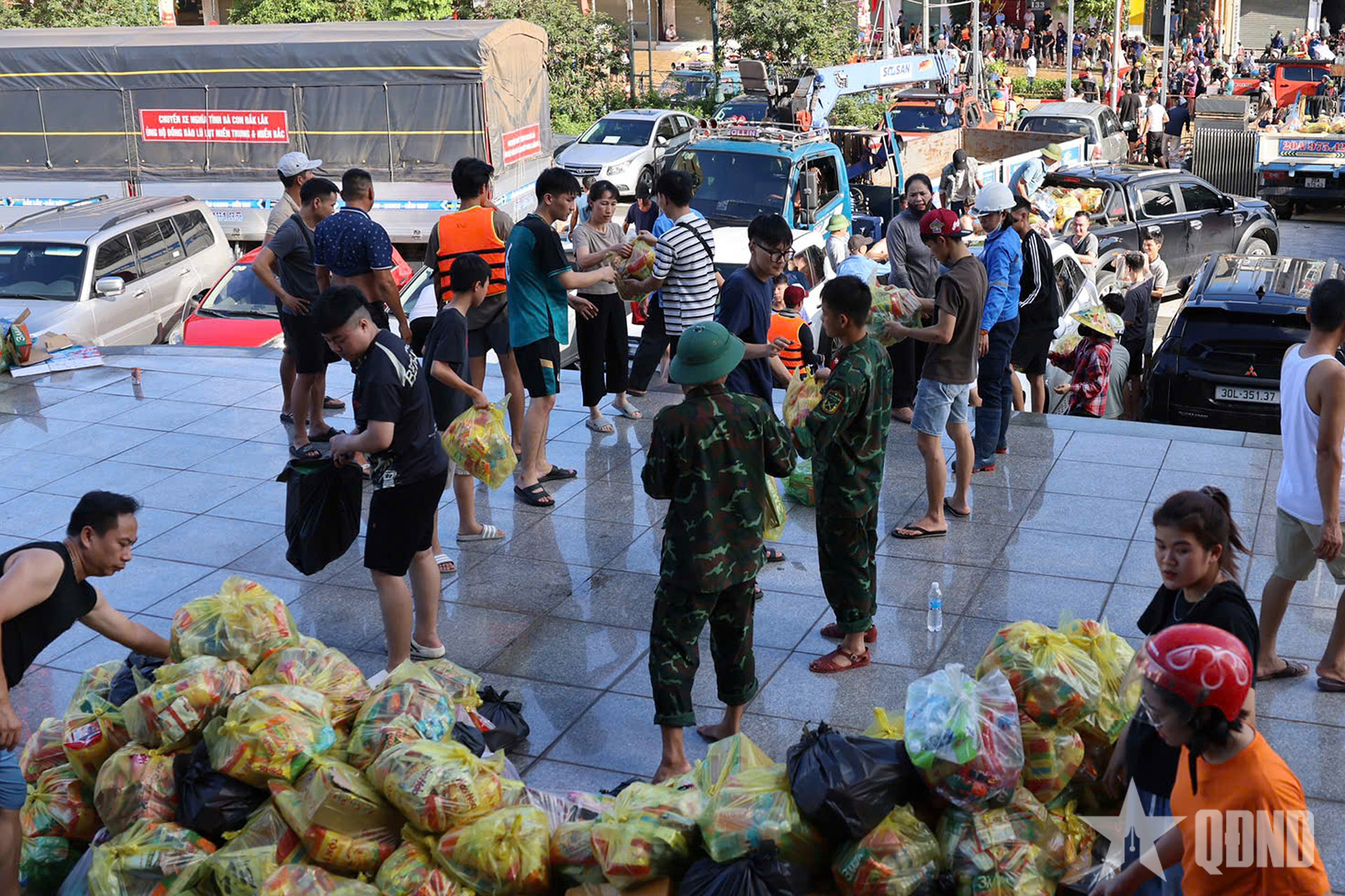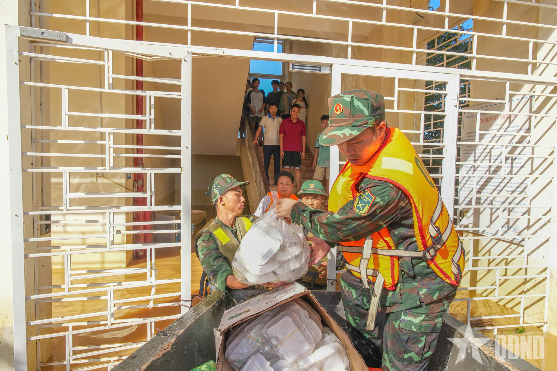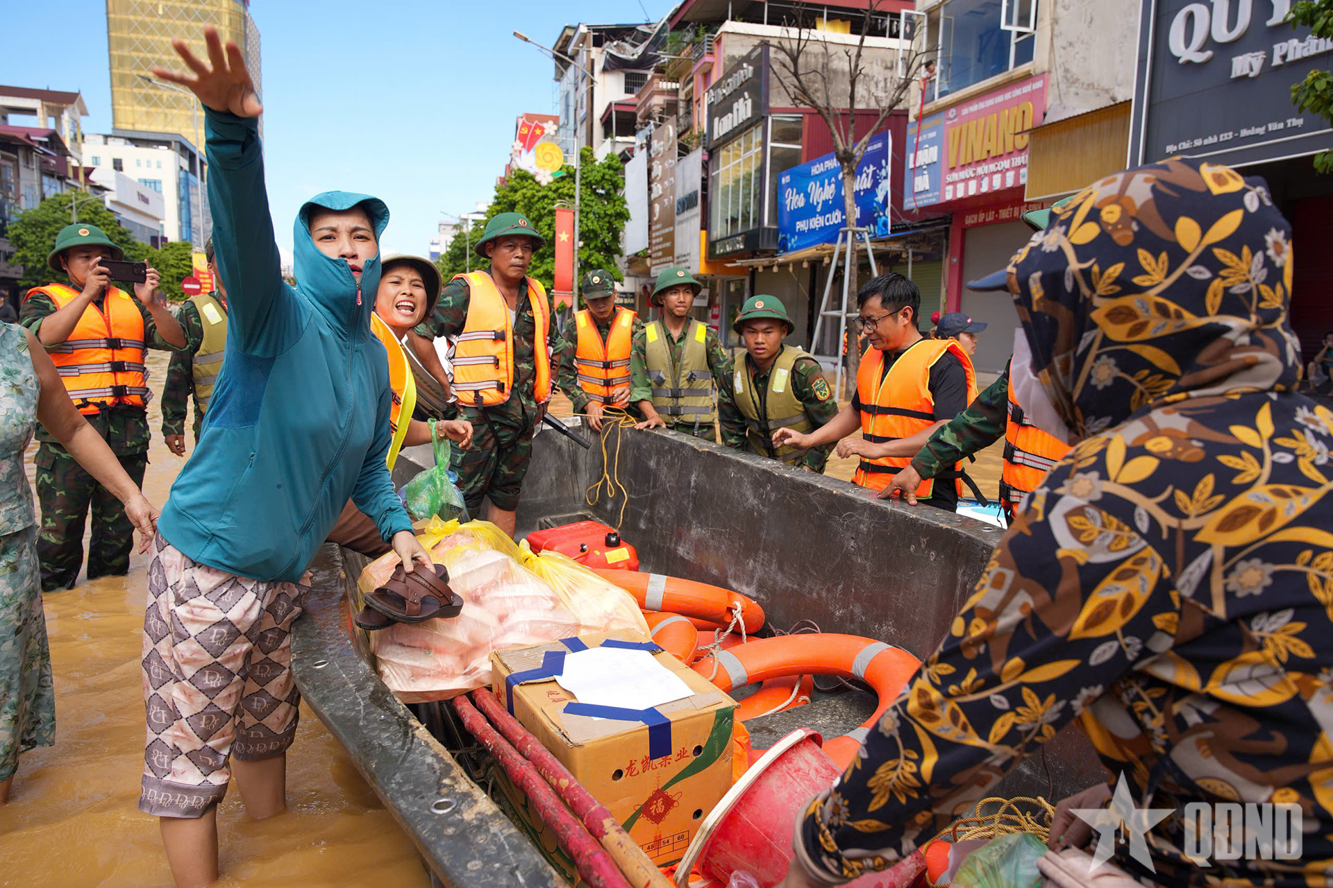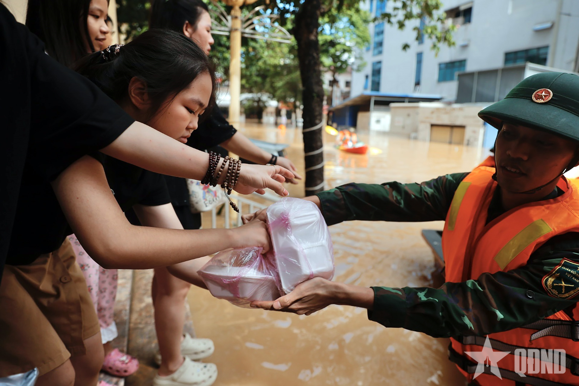 Đoàn cứu hộ Quân khu 1 vận chuyển đồ ăn, nước uống cho người dân khu vực bị ngập sâu ở phường Phan Đình Phùng, tỉnh Thái Nguyên.