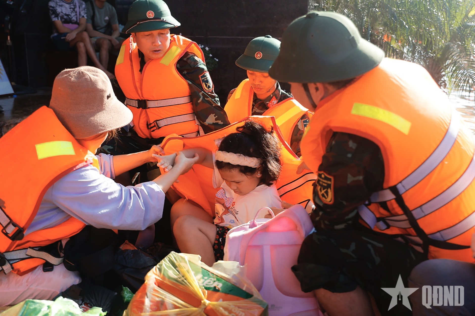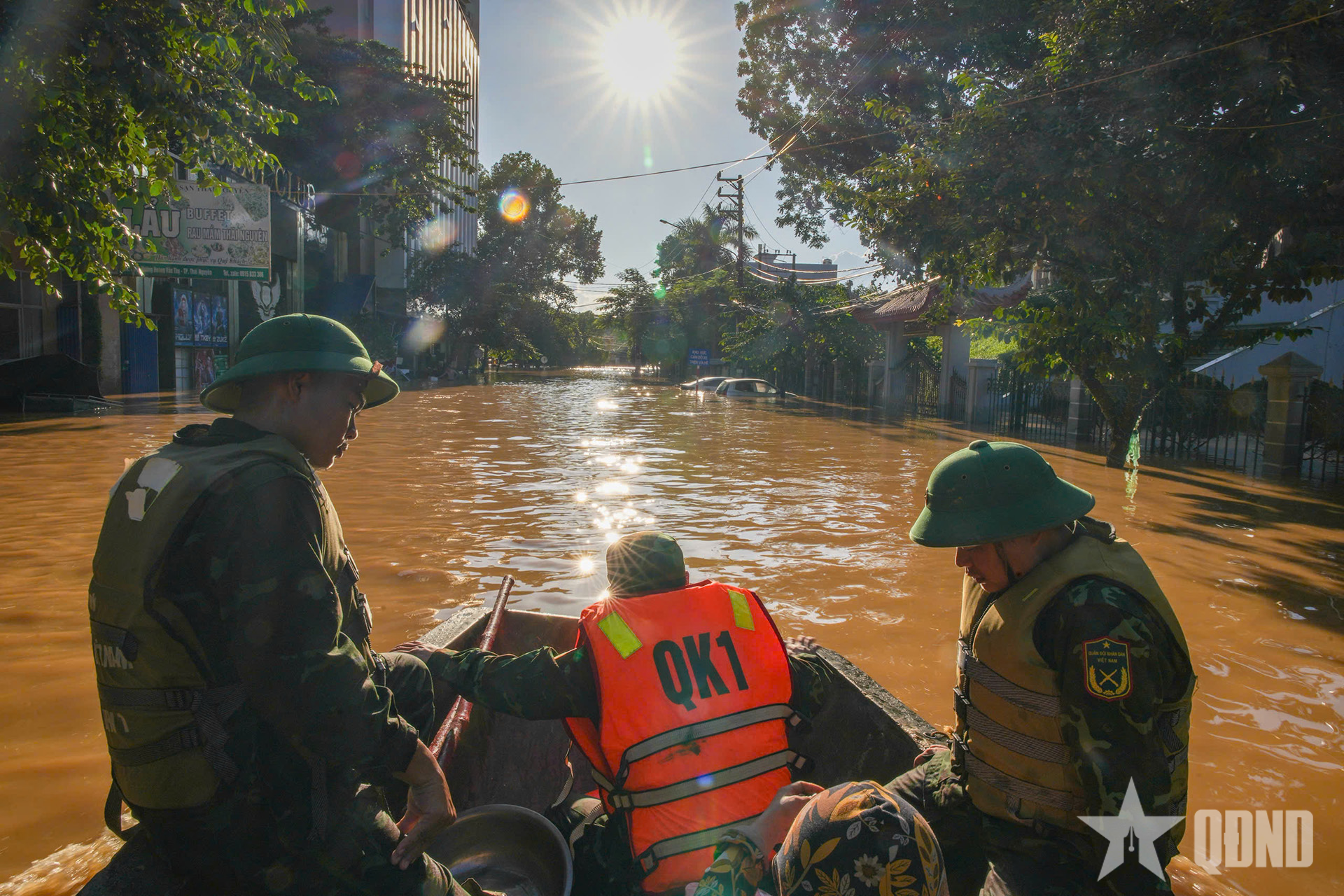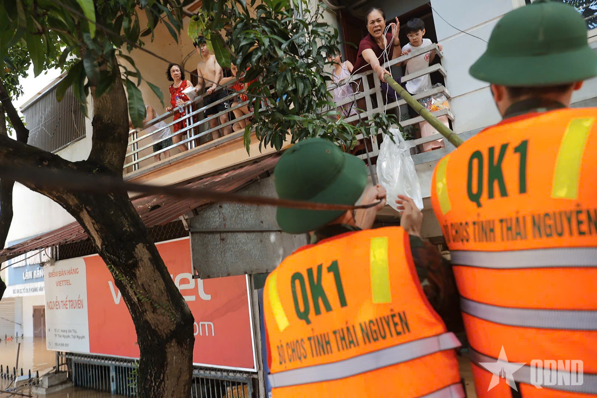 Cán bộ, chiến sĩ Quân khu 1 giúp dân di chuyển ra khỏi khu vực bị ngập sâu ở phường Phan Đình Phùng, tỉnh Thái Nguyên.