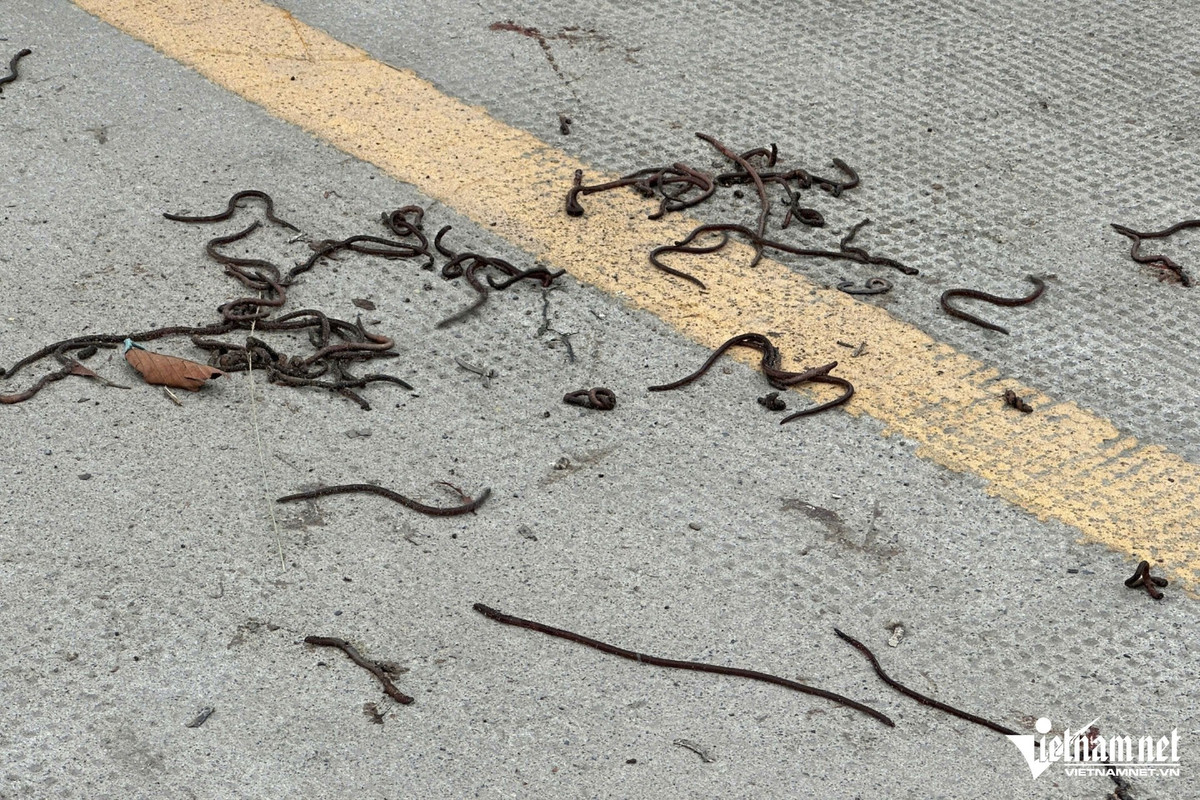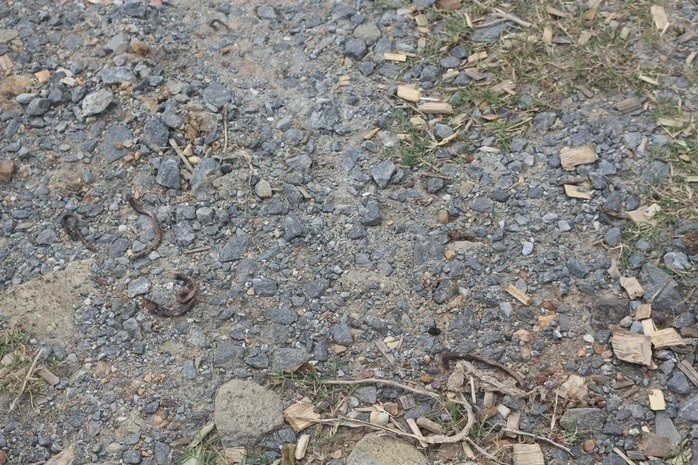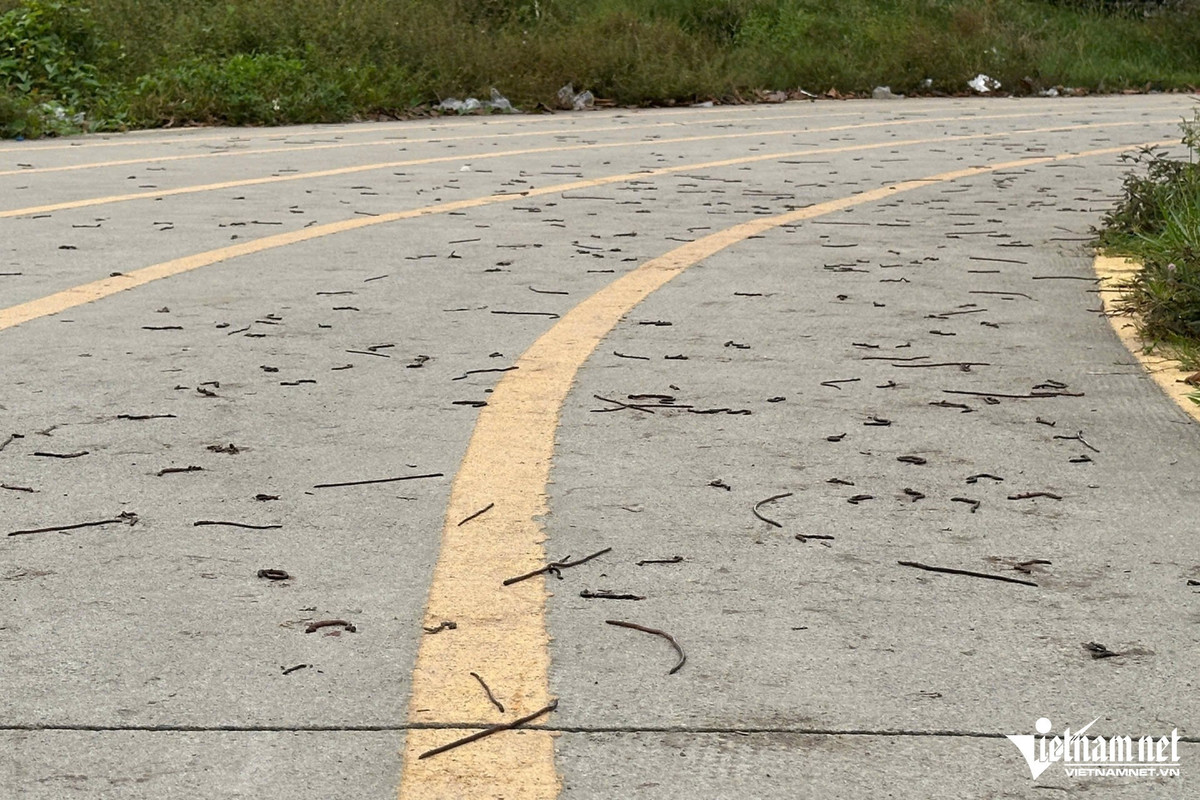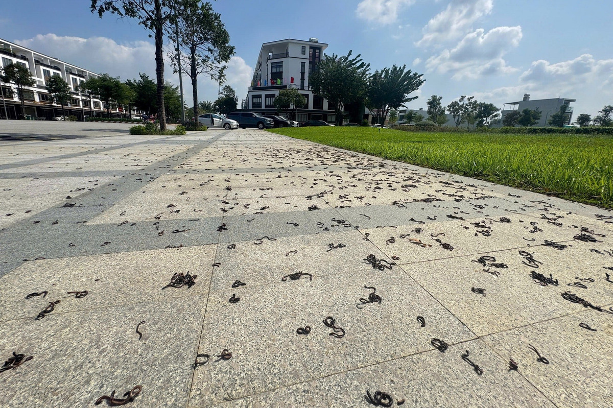 Dưới ánh nắng Mặt trời, nhiều con giun chết khô quắt lại trên đoạn đường dài tạo nên cảnh tượng đáng sợ khiến một số người dân lo lắng, hoang mang. Ảnh: Người lao động.