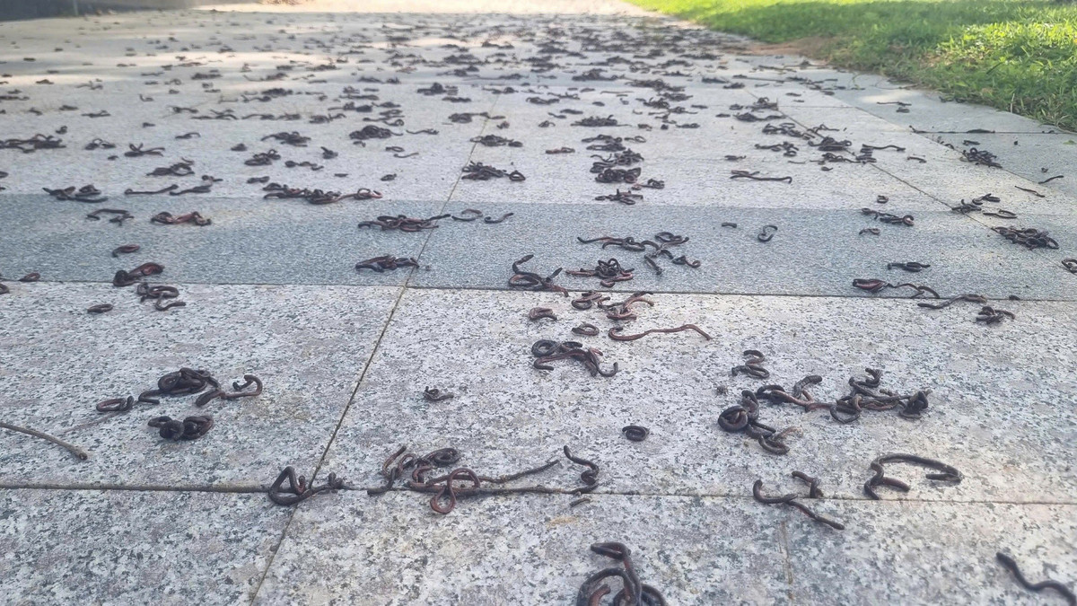Ngày 14/11 vừa qua, người dân tại một khu đô thị lớn ở phường Cẩm Thành (tỉnh Quảng Ngãi) bất ngờ khi nhìn thấy hàng nghìn con giun đất trồi lên mặt đất, bò thành từng mảng dày đặc trên vỉa hè. Ảnh: Vietnamnet.