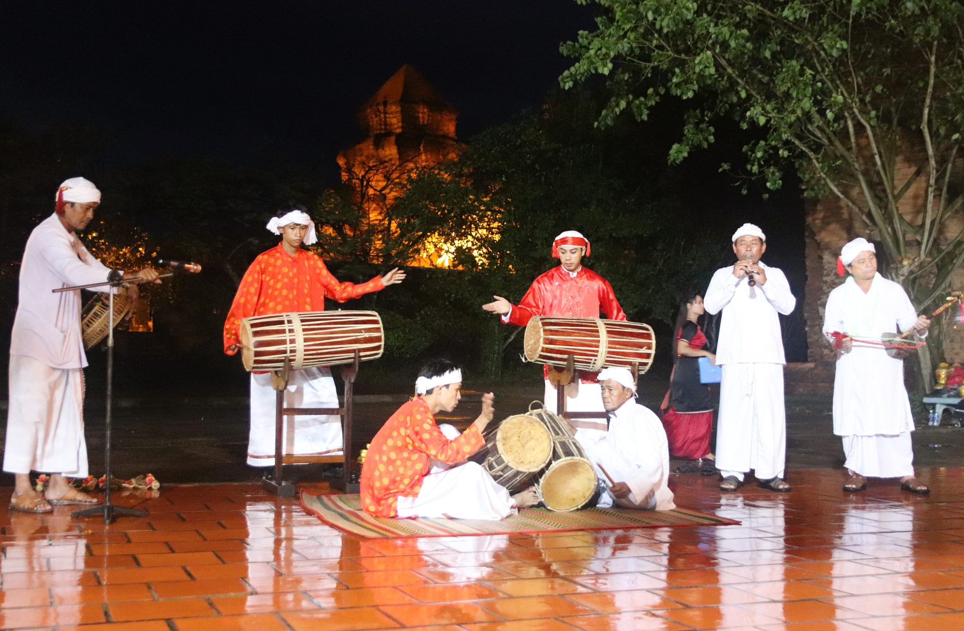Khi màn đêm buông xuống, tháp Chăm cổ kính hiện lên trầm mặc, huyền ảo trong ánh đèn vàng dịu. Giữa không gian linh thiêng ấy, tiếng trống ginăng vang lên rộn ràng, tiếng kèn saranai ngân nga trong gió, mở đầu cho buổi biểu diễn nghệ thuật dân gian Chăm phục vụ du khách quốc tế.