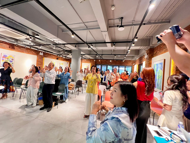 Các cô chú người cao tuổi cùng tham gia một hoạt động vận động cơ thể tại chương trình.