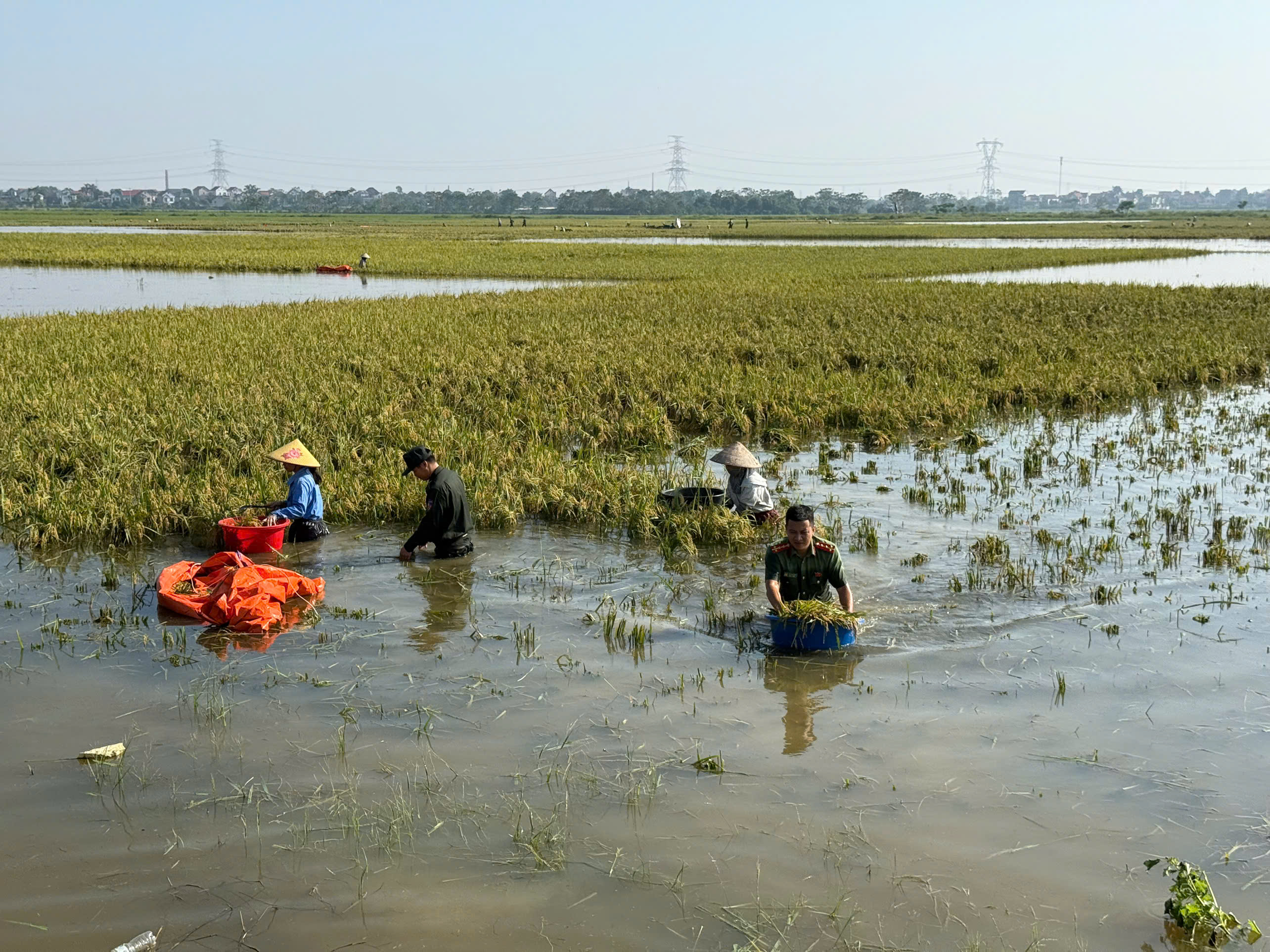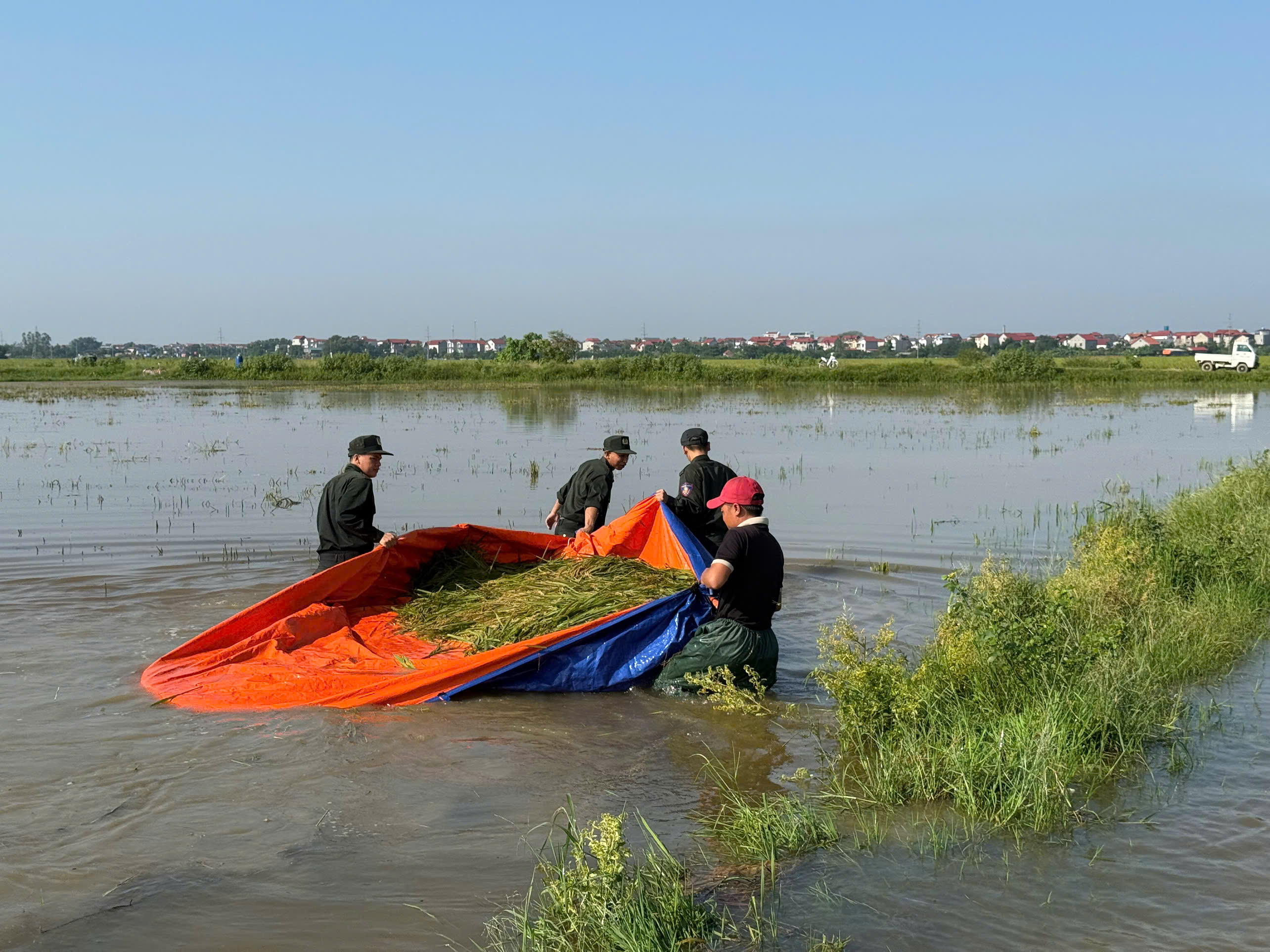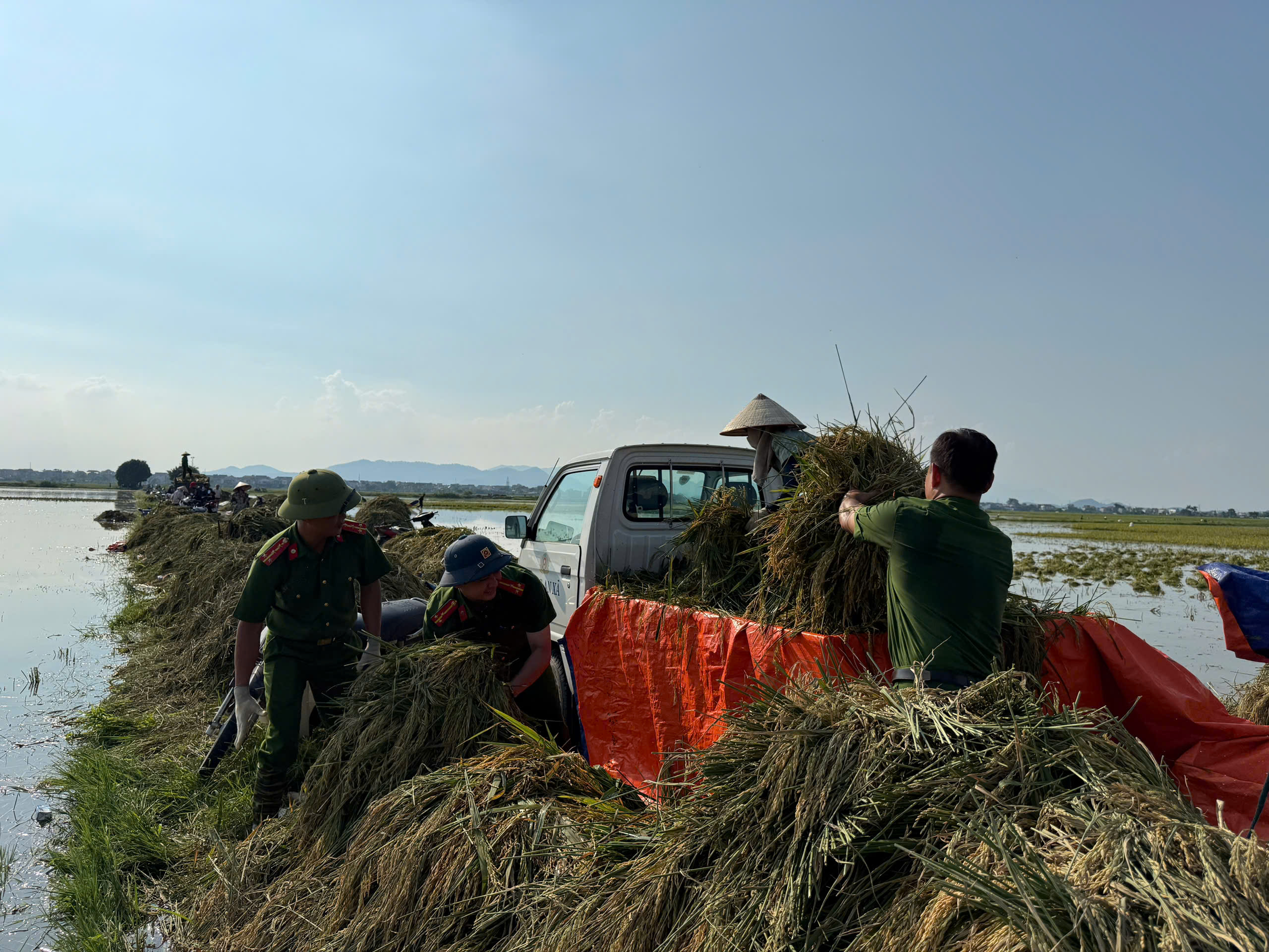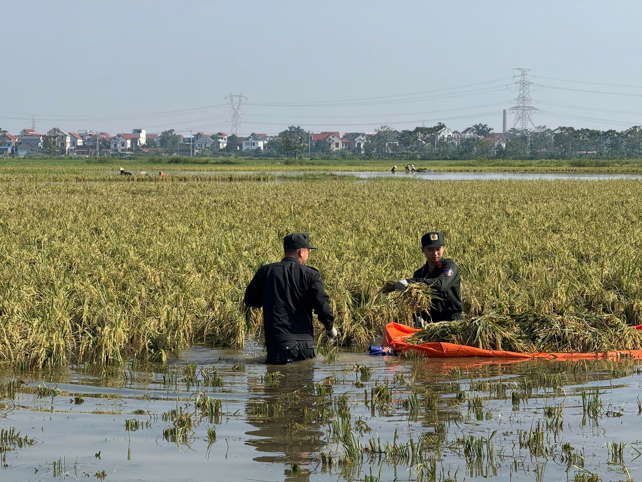 Lực lượng CSCĐ hỗ trợ thu hoạch lúa giúp bà con xã Đa Phúc trên cánh đồng ngập chìm trong biển nước