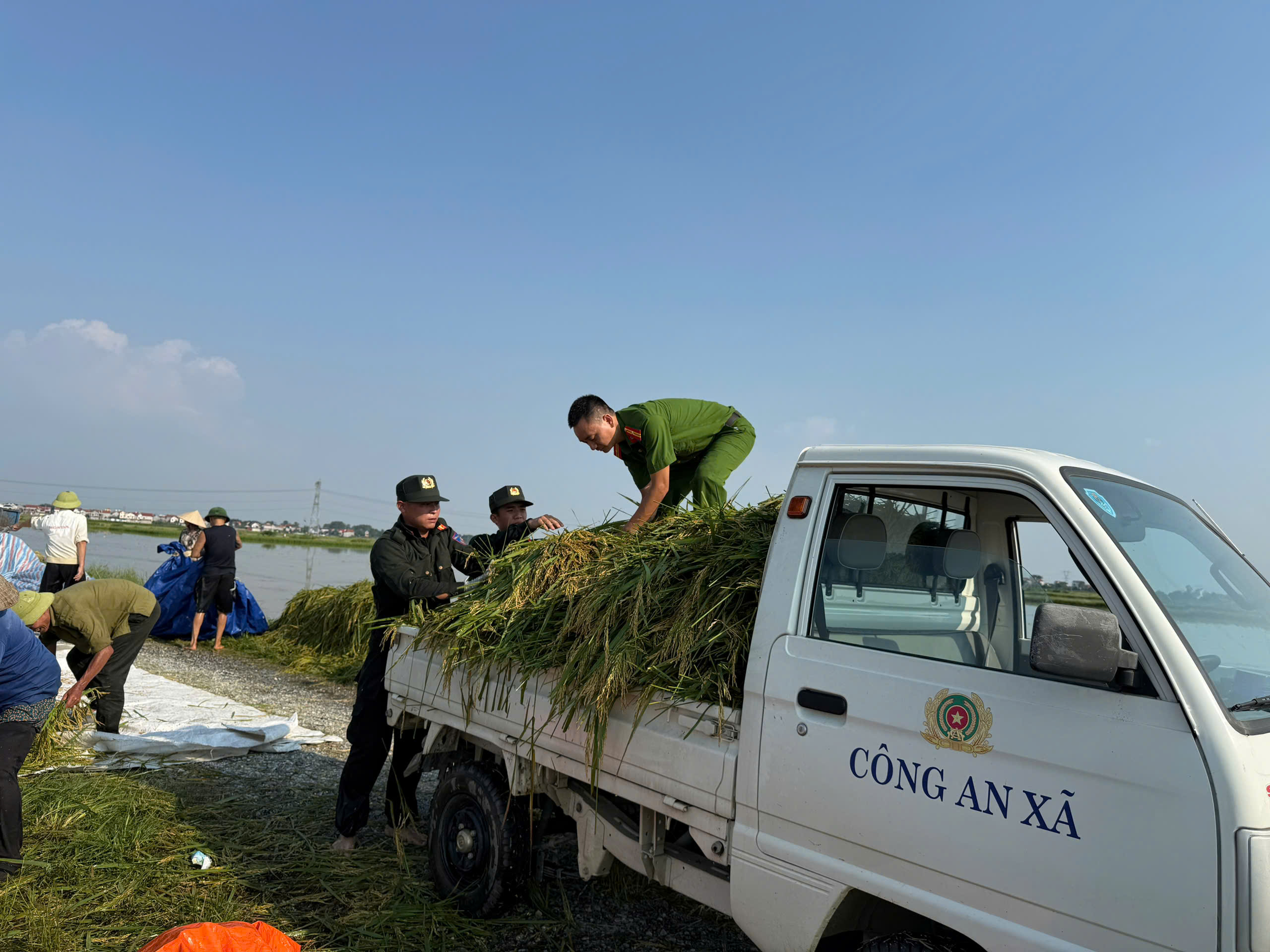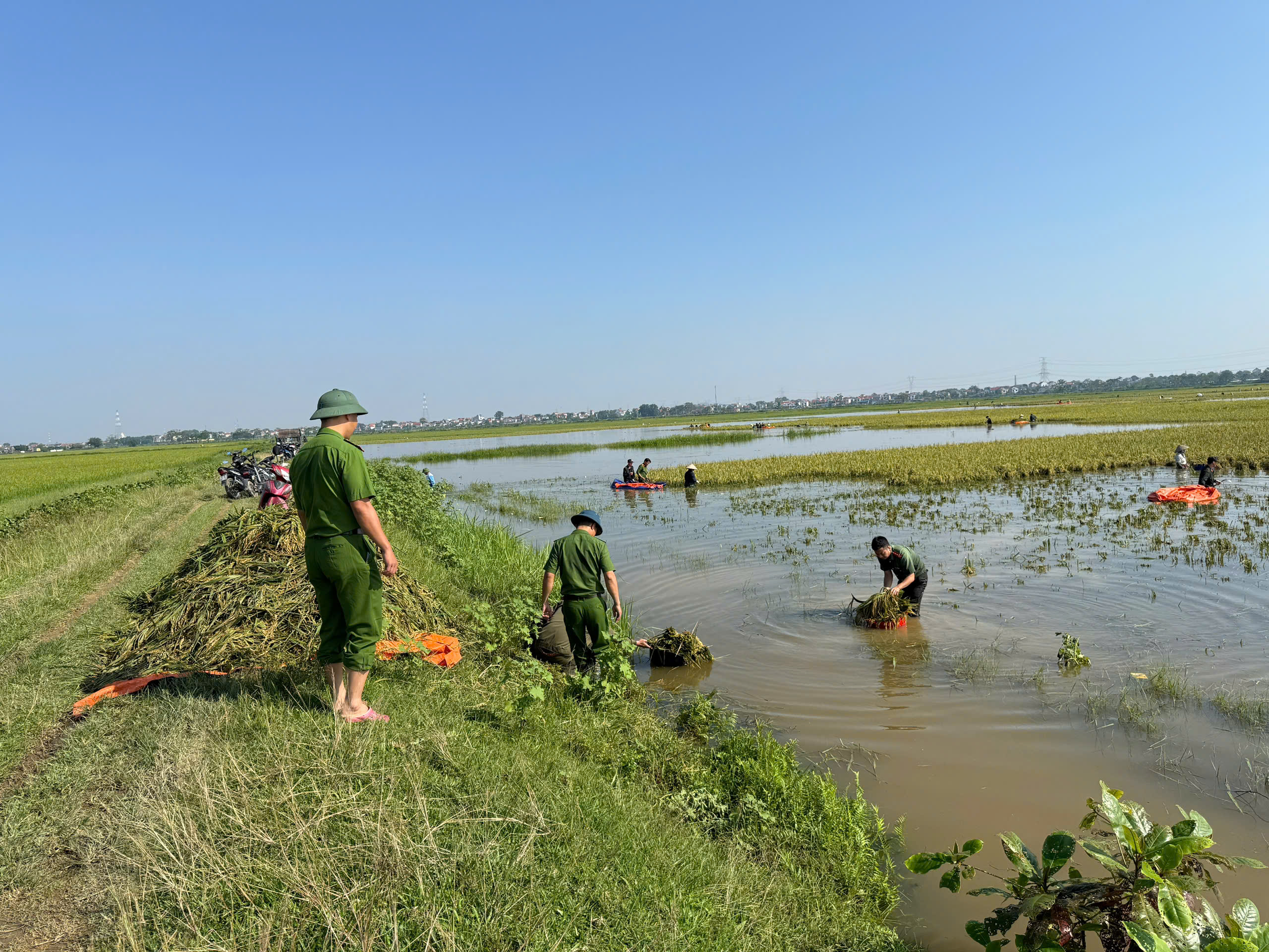 Trong ngày 8 và 9-10, lực lượng Công an xã căng mình vừa phân chia lực lượng gia cố đê tránh nước ngập tràn vào khu dân cư, đồng thời hỗ trợ gặt lúa trên cánh đồng bị ngập úng
