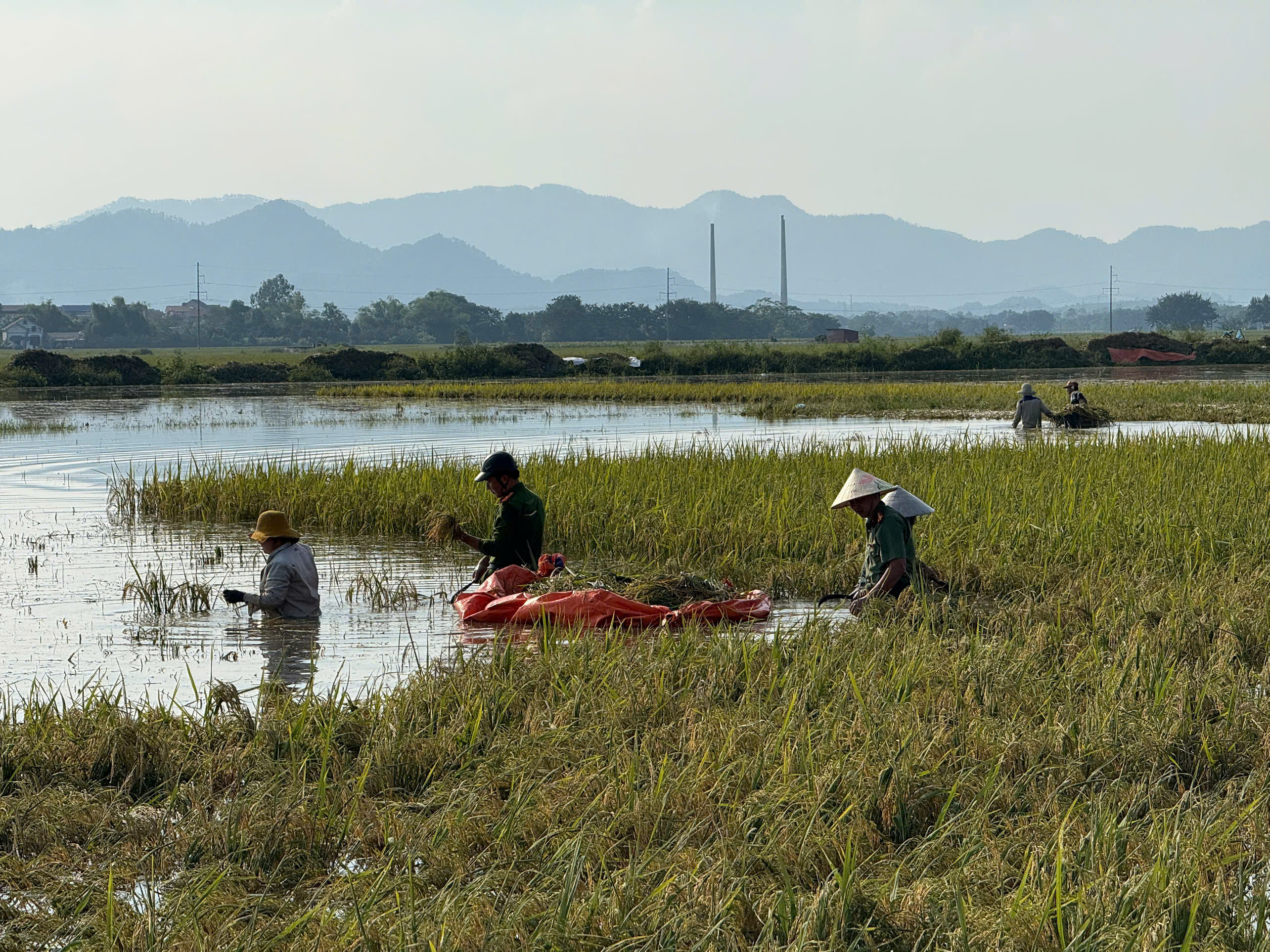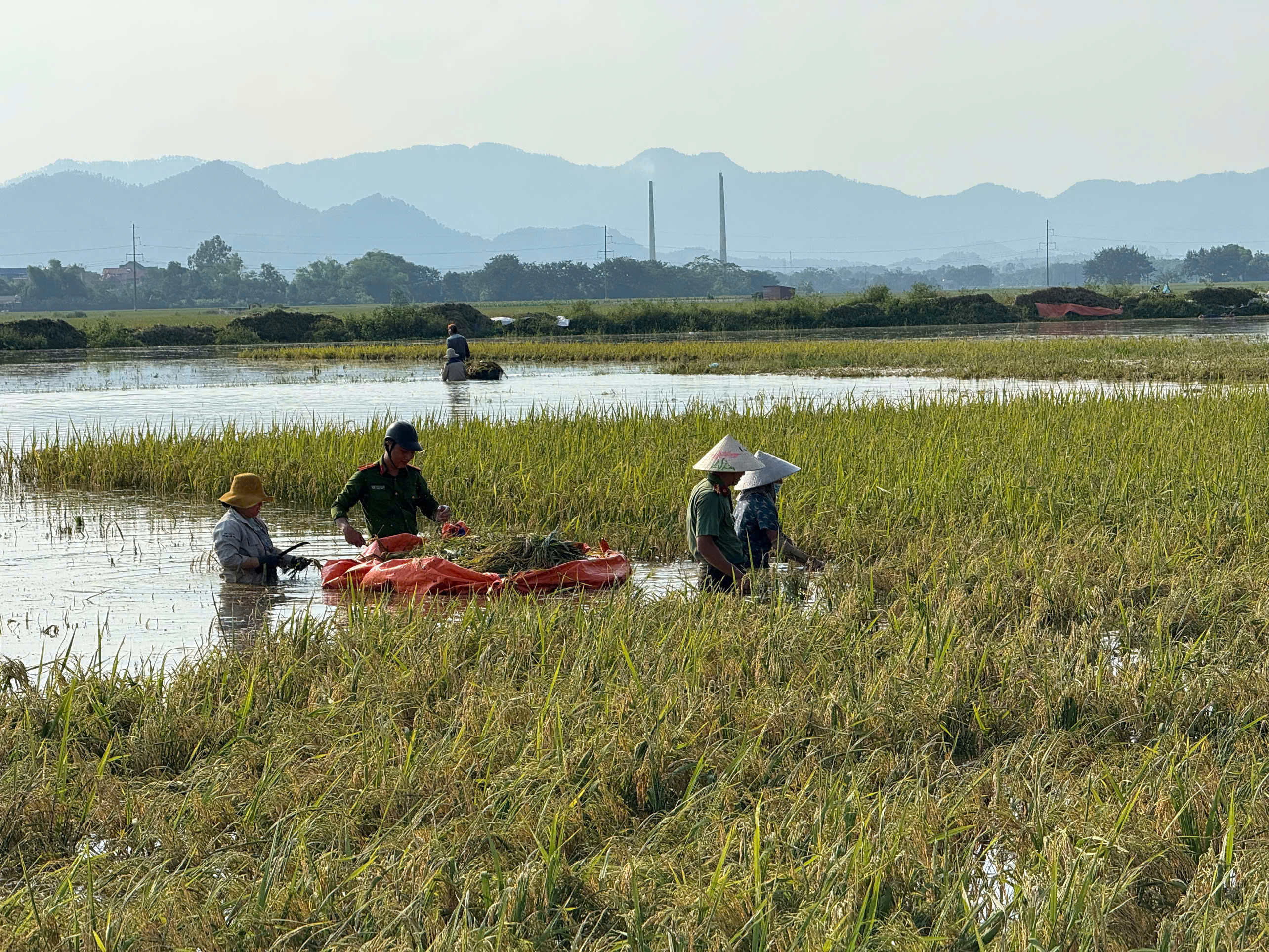 Cánh đồng xã Đa Phúc mênh mông nước, việc thu hoạch lúa gặp khó khăn, tuy nhiên được sự hỗ trợ của lực lượng Công an nên bà con đã bớt vất vả hơn nhiều